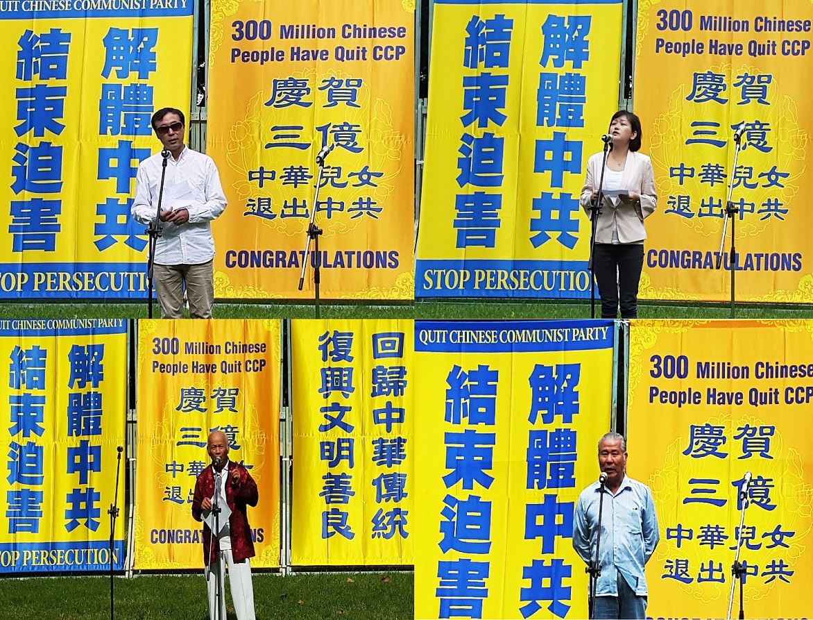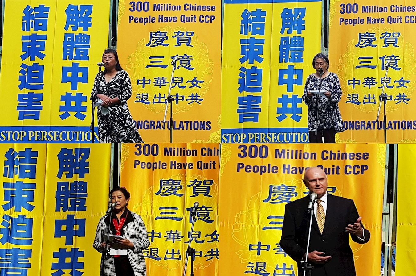 ![]() 图2:前来声援和庆祝“三亿中国人三:退.”的嘉宾,左上:原中共退役军官胡伟先生,右上:民主阵线悉尼分部副主席张炎女士,左下:道家功夫中华太极八卦总会创办人威廉先生(William Ho),右下:澳洲之声的张延良先生。 |