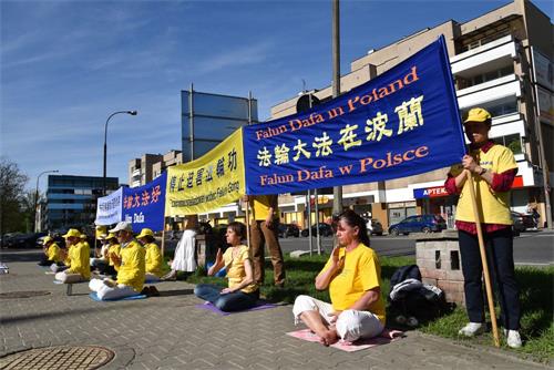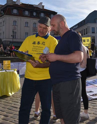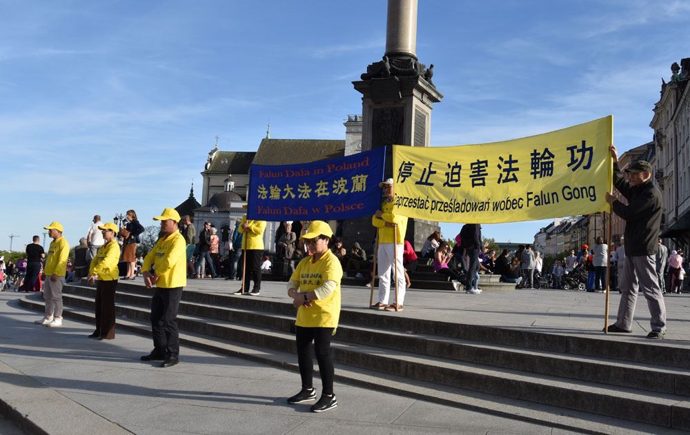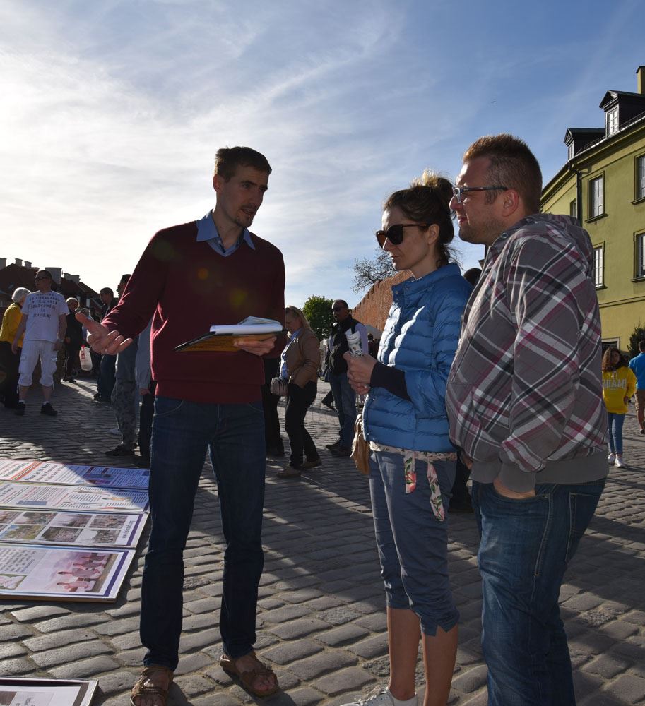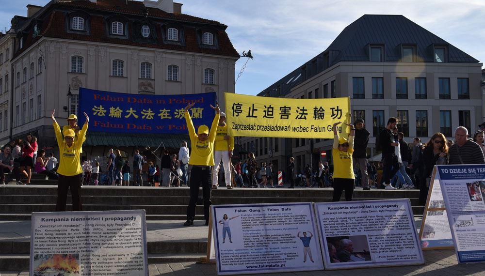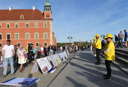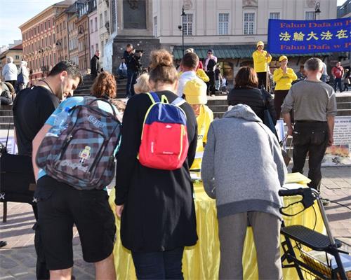 下午五点,学员来到华沙古城中心广场,为众多游客讲解法轮功真相,征签反对中共迫害,并展示功法,受到广泛关注和欢迎。真相展板前站满了观看的人群,络绎不绝的游人前来参加反对中共迫害的征签活动。法轮功功法更是受到人们的喜爱,大家纷纷拿出相机手机拍照录像,很多人都印象深刻地记住了“法轮功”。