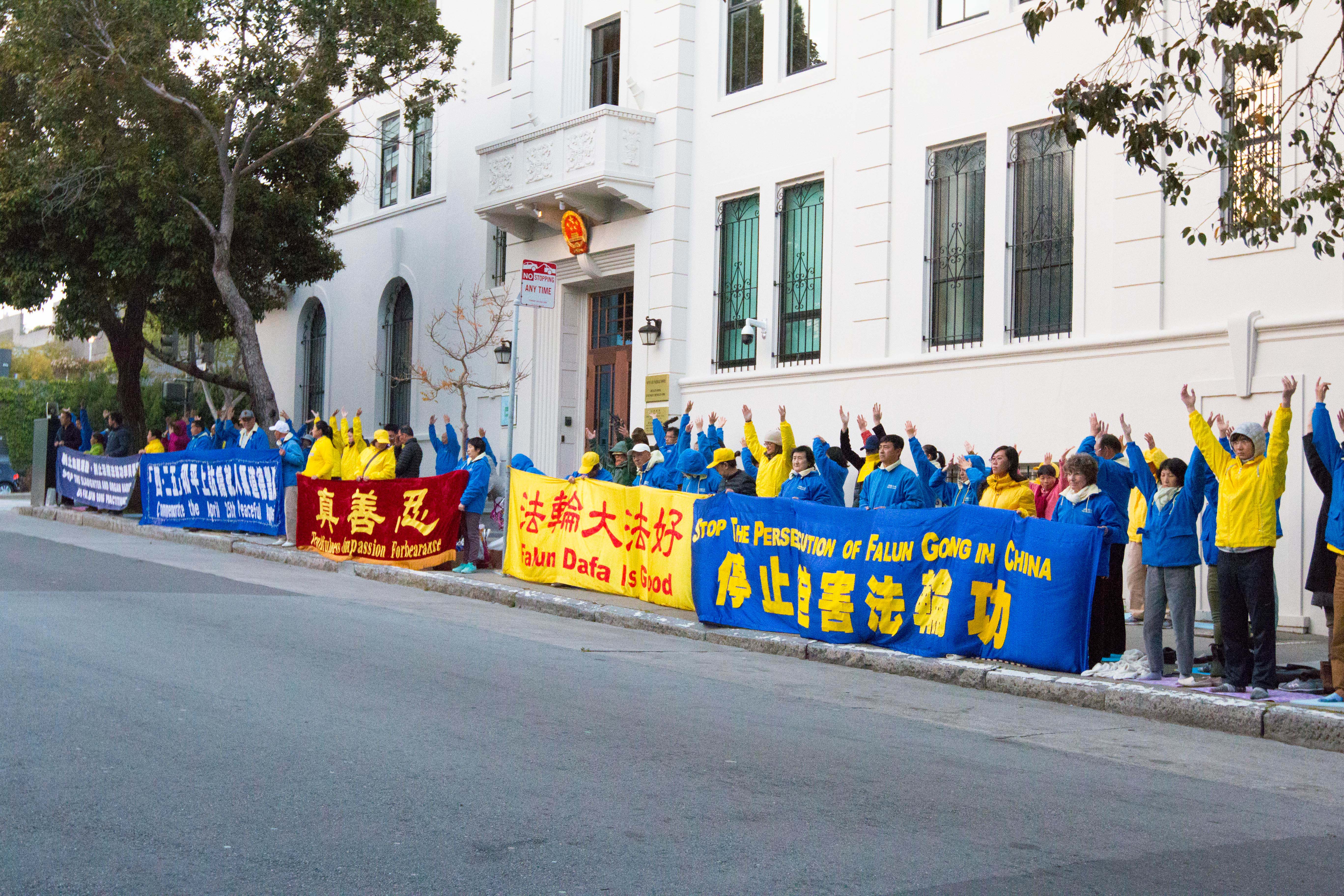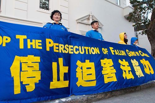 夜幕降临,法轮功学员在中领馆前打着的横幅上写着“四二五和平上访铸就人类道德丰碑”、“停止迫害法轮功”、“全民起诉迫害元凶江泽民”。也有学员在领馆前炼功,或派发真相资料,呼吁人们关注在中国发生的迫害。行人接过传单了解了真相后,对法轮功和平反迫害表示支持。