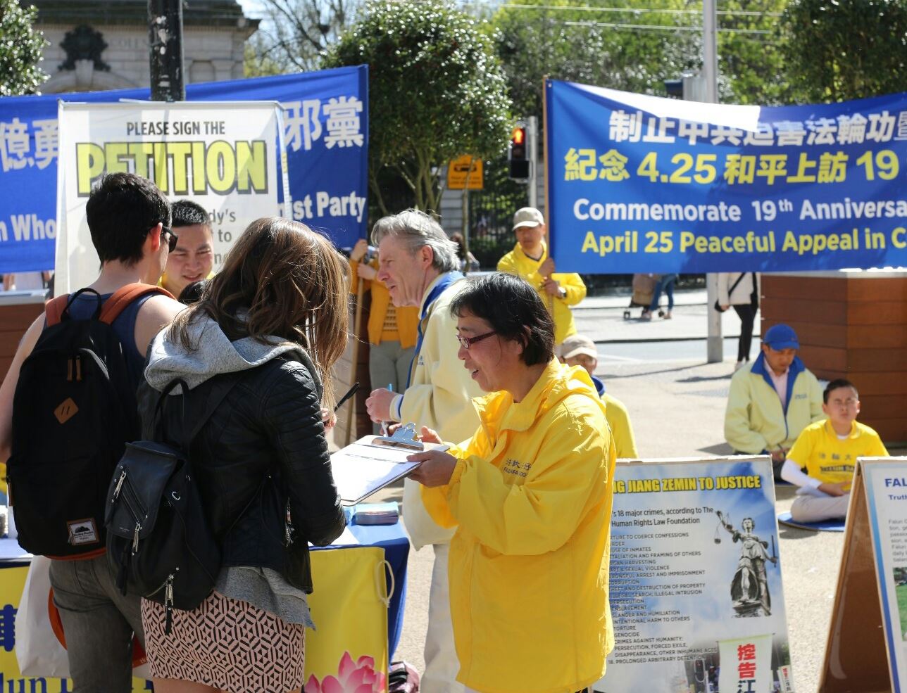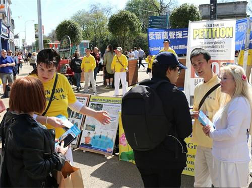 法轮功学员郭女士说,有两位中国女士领着孩子从旁边的车站下车就看到集会场地,两位女士一边说着“是法轮功”,一边拿出手机拍照。郭女士走上去和她们攀谈,讲明三:退.的重要性,最后两位女士和孩子四人都退出了以前入过的中共团、队组织,并收下了真相报。活动当天,十多名中国同胞在法轮功学员的帮助下,退出了中共党、团、队组织。