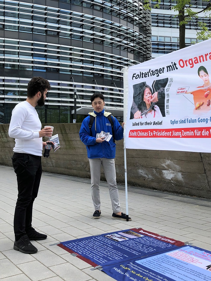 一位穿西装的男士对学员讲,他能回忆起迫害发生时德国媒体也受了中共影响,对法轮功有过不符合事实的报道。他说:“我还一直想,那个报道怎么没有下文了呢?今天看到你们我才知道事情的发展。“他和学员聊了十几分钟,临走时向学员道谢。
