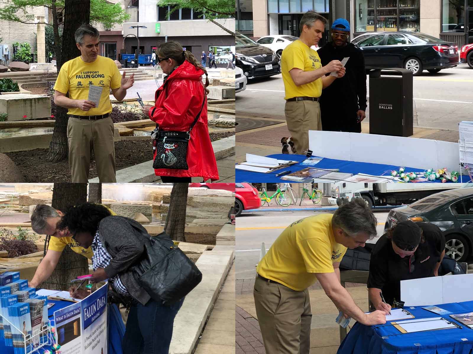年轻的Lopez女士在午餐的路上被法轮功学员的功法演示所吸引,她表示这功法给人感觉非常的祥和,心里很舒服。她从来没有听说过法轮功,更不知道在中国发生的迫害。听完学员的介绍后,她真的觉得这迫害太让人遗憾,立即在征签表上签名要求停止迫害、停止活摘法轮功学员器官。她家住达拉斯北部的艾伦Allen市,想有机会也试试炼功,很高兴的接过五月十三法轮大法日活动的传单。