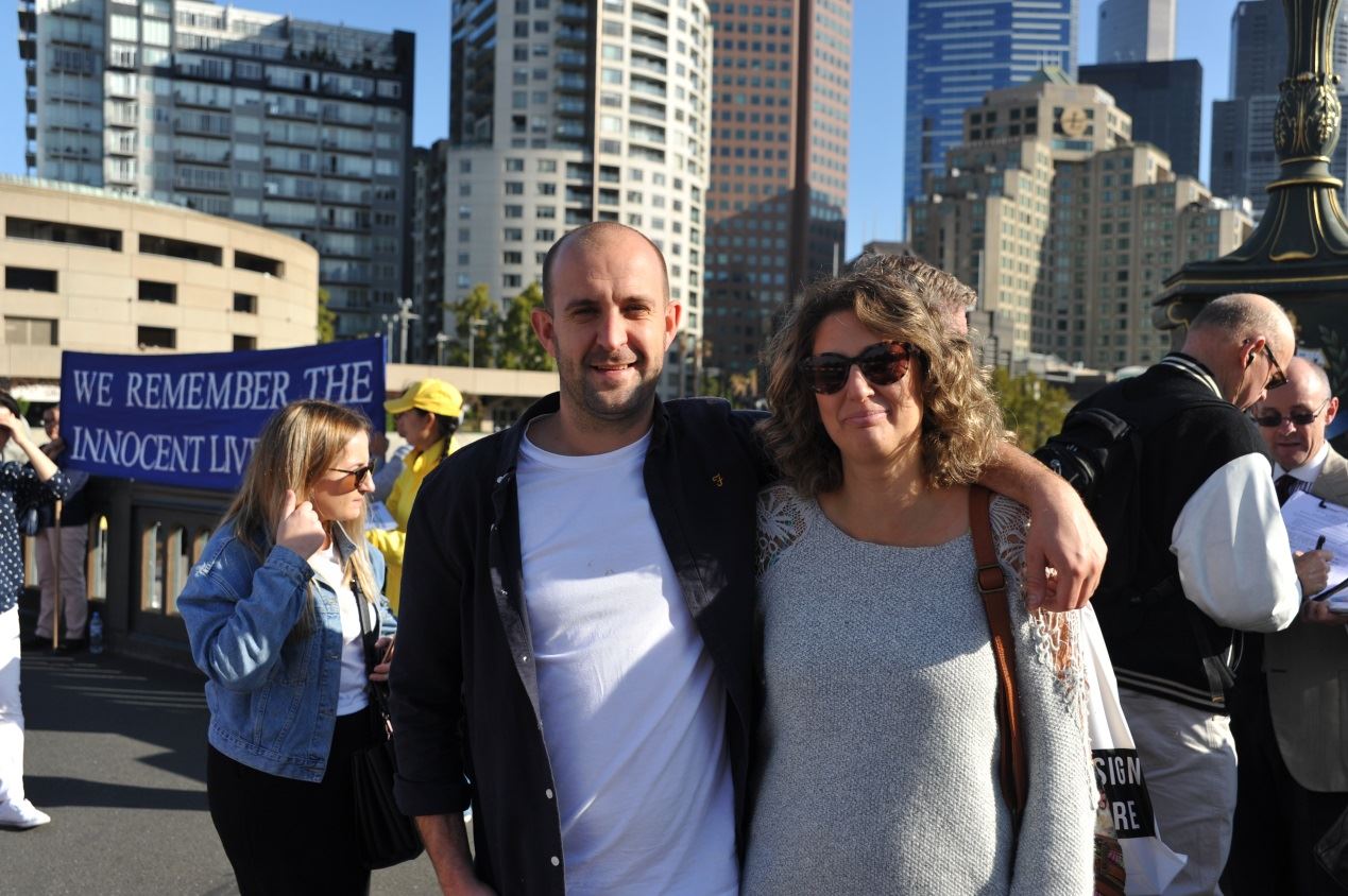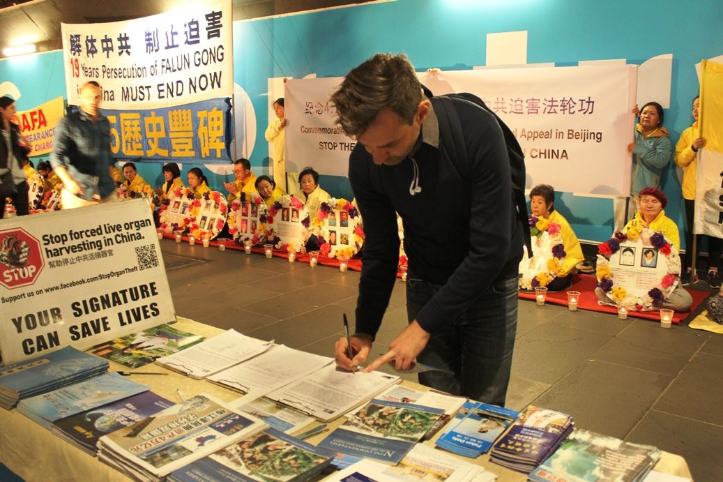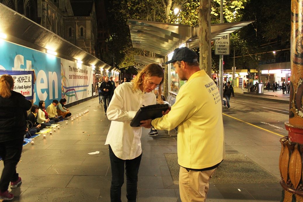 家住Hurstbridge区,在市中心一家餐厅工作的布朗宁(Matt Browning),当晚是第一次听说法轮功,路过烛光夜悼的现场,才了解到在中国发生的对无辜百姓的惨绝人寰的迫害,立即签名支持法轮功学员的反迫害。“太可怕了,因为和平的抗争就被谋杀,绝不该发生。法轮功学员很显然是在努力为世界带来和平的团体,但他们的器官却被活摘,不能允许这样的事情继续下去。”他接着说:“虽然我现在还了解的不多,但我认为,我们的政府和民众应该支持法轮功学员的诉求,迫害和活摘器官绝对不能再继续下去了。”他最后表示会和亲友同事分享当晚了解到的信息。