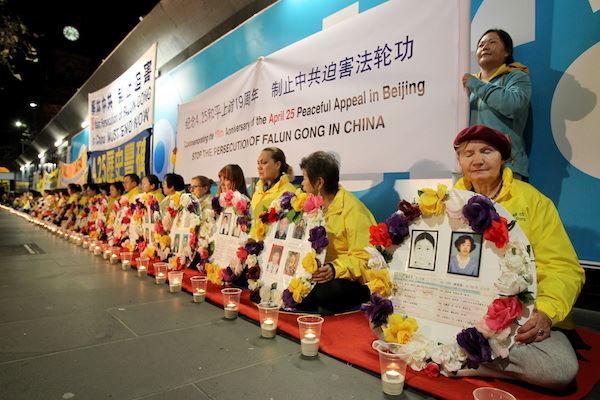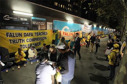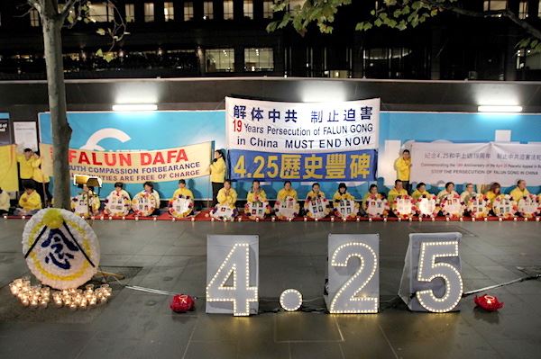 ![]() 图5~6:墨尔本法轮功学员在市中心举行烛光夜悼,场面肃穆庄严,纪念“四·二五”和平上访十九周年 |