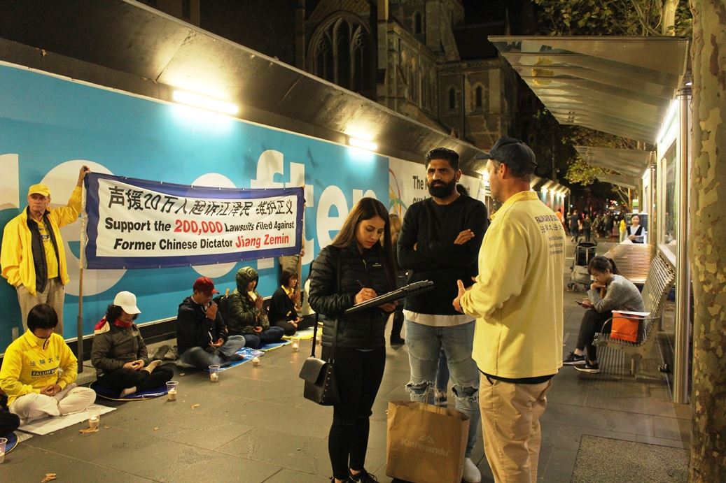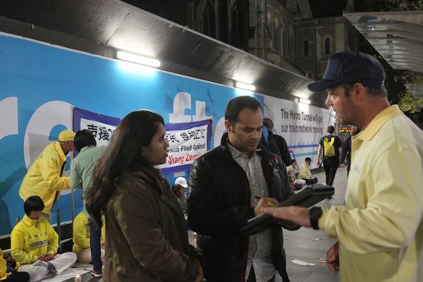 来自印度裔澳洲公民的凯尔(Manpreet Keur)女士和丈夫在签名簿上签字后,告诉记者,“我们是特意返回来签字的,因为稍早路过的时候,法轮功学员还在布置活动现场。”她说:“就因为坚持修炼而被当局非法摘取器官,实在残忍。我本人也相信打坐,因此感同身受。这些修炼人绝对不应该面临这样的结果,但居然发生在当今的世界,太不人道,无法想象中共能做出这样的事情,真的难以置信。所以我们一定要支持法轮功学员。”“真善忍是普世价值,每一个当然都需要这些价值观。”凯尔还表示,“我希望我们的政府也能支持这些法轮功学员,帮助停止迫害、制止群体灭绝。”