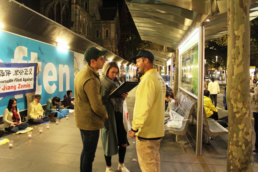 四月二十五日当晚,在墨尔本市中心举办的烛光夜悼活动期间,很多过往民众和游客驻足了解真相,拍摄震撼心灵的一幕,一对来自德国的老年游客夫妇表示,真善忍理念是这个社会的解药。