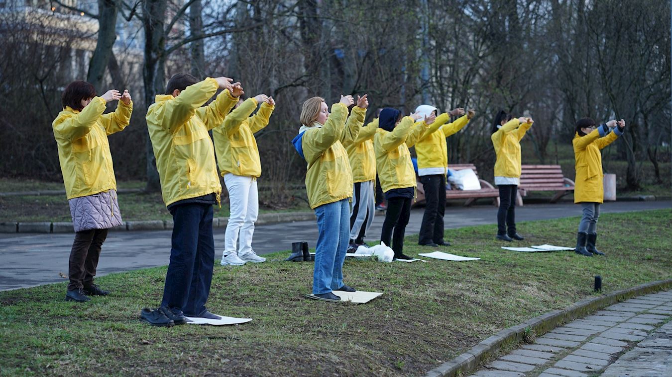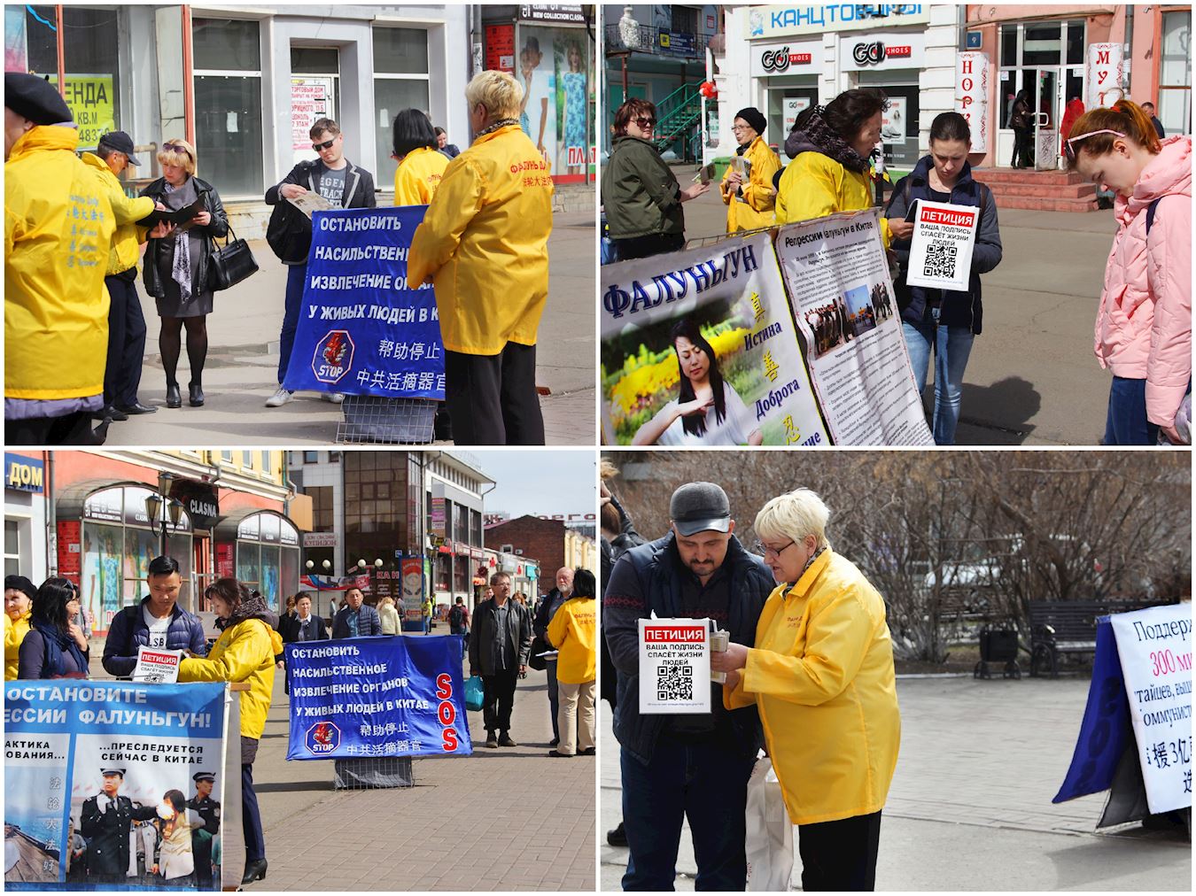 位于西伯利亚地区的重要城市伊尔库茨克,四月二十三日,法轮功学员在市中心的乌利茨基步行街上(Uritsky)向过往民众展示功法动作,派发真相资料。当地民众纷纷驻足阅读真相展板,了解法轮功在中国被残酷迫害的真相。