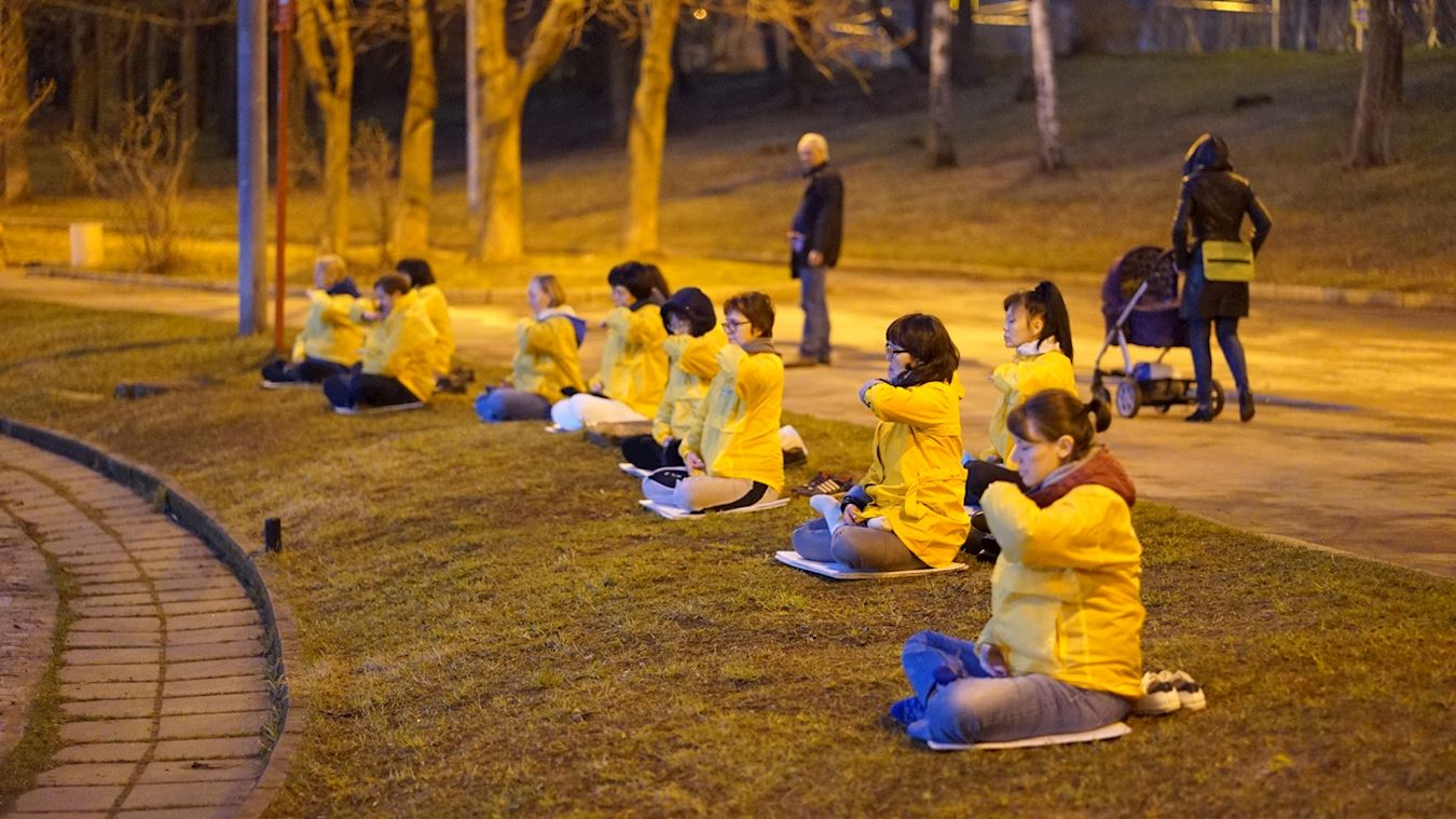 二零一八年四月二十五日,在莫斯科中领馆前法轮功学员进行的单人抗议接力从早上十一点持续到晚上十点。期间过往行人和车辆阅读展板内容,不少人对法轮功学员表示关心。旁边居住的很多民众已经对法轮功学员非常熟悉了,法轮功学员手举“停止迫害法轮功”的展板,呼吁更多民众了解迫害真相,共同制止这场践踏普世价值“真、善、忍”和对全人类道德良心的破坏。并且集体炼功和在晚间烛光守夜纪念在这场迫害中失去生命的学员。