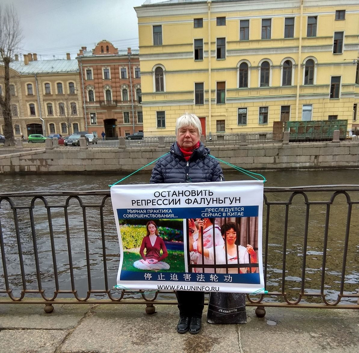 同日,在圣彼得堡中领馆前单人抗议接力同样持续一整天,十五位法轮功学员手举展板,要求中共停止对法轮功学员的迫害,呼吁民众共同起来制止这场迫害。在使馆前排队办理去中国签证的民众,认真观看展板内容。大部份当地居民因为经常看到法轮功学员,已经了解了这场迫害的真相。一些民众停下来询问今天在此活动的原因,听后他们又一次对学员表示同情和支持。一位年轻小伙子说:“邪恶在各处都在努力摧毁人的自由。因此,不应该对别人的麻烦视而不见,而是表现出自己的意志。”他拿走了所有的信息资料,并了解到他可以在互联网上表达自己的抗议后,承诺这样做。