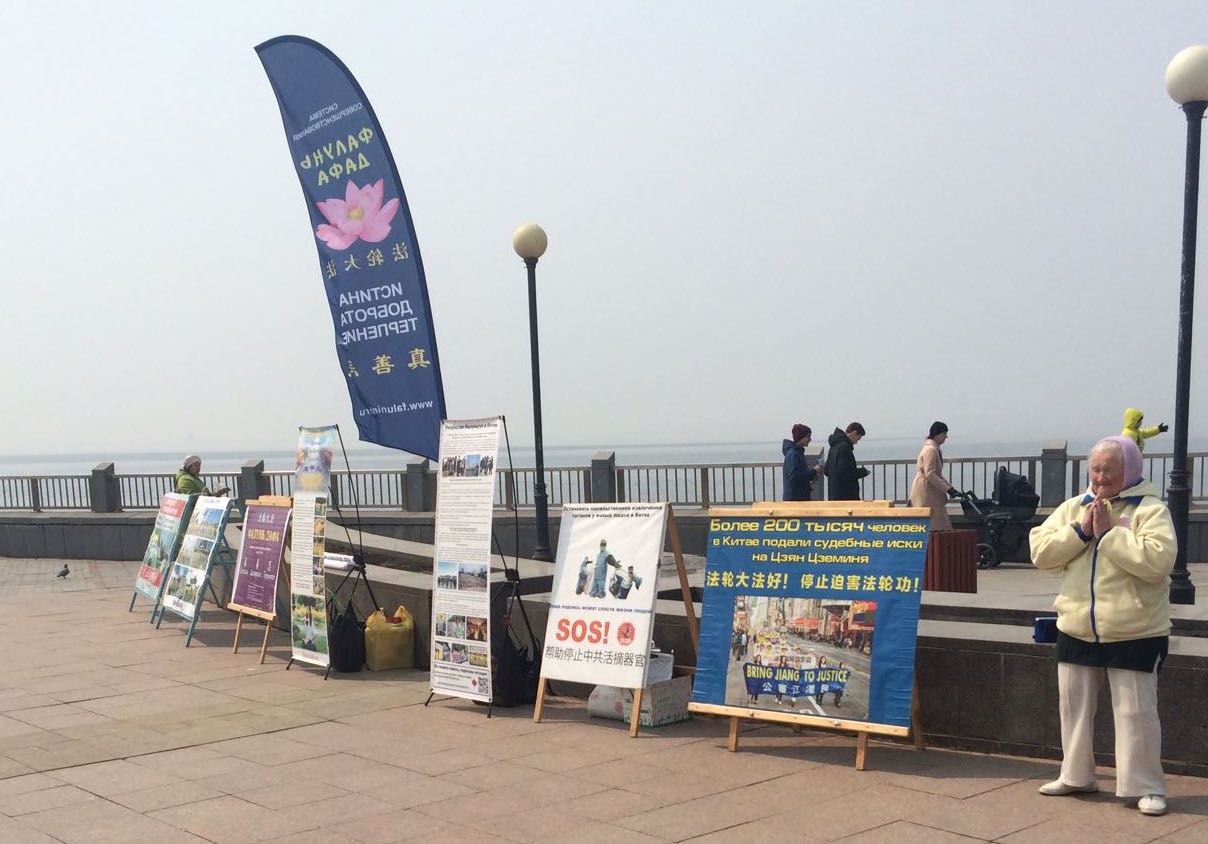 四月二十一日,在海参崴(Vladivostok)市中心的沿海街上和乌兰乌德市(Ulan-Ude)包括热闹的购物中心旁等多个地点炼功、发资料,并且向来往行人征签讲真相。