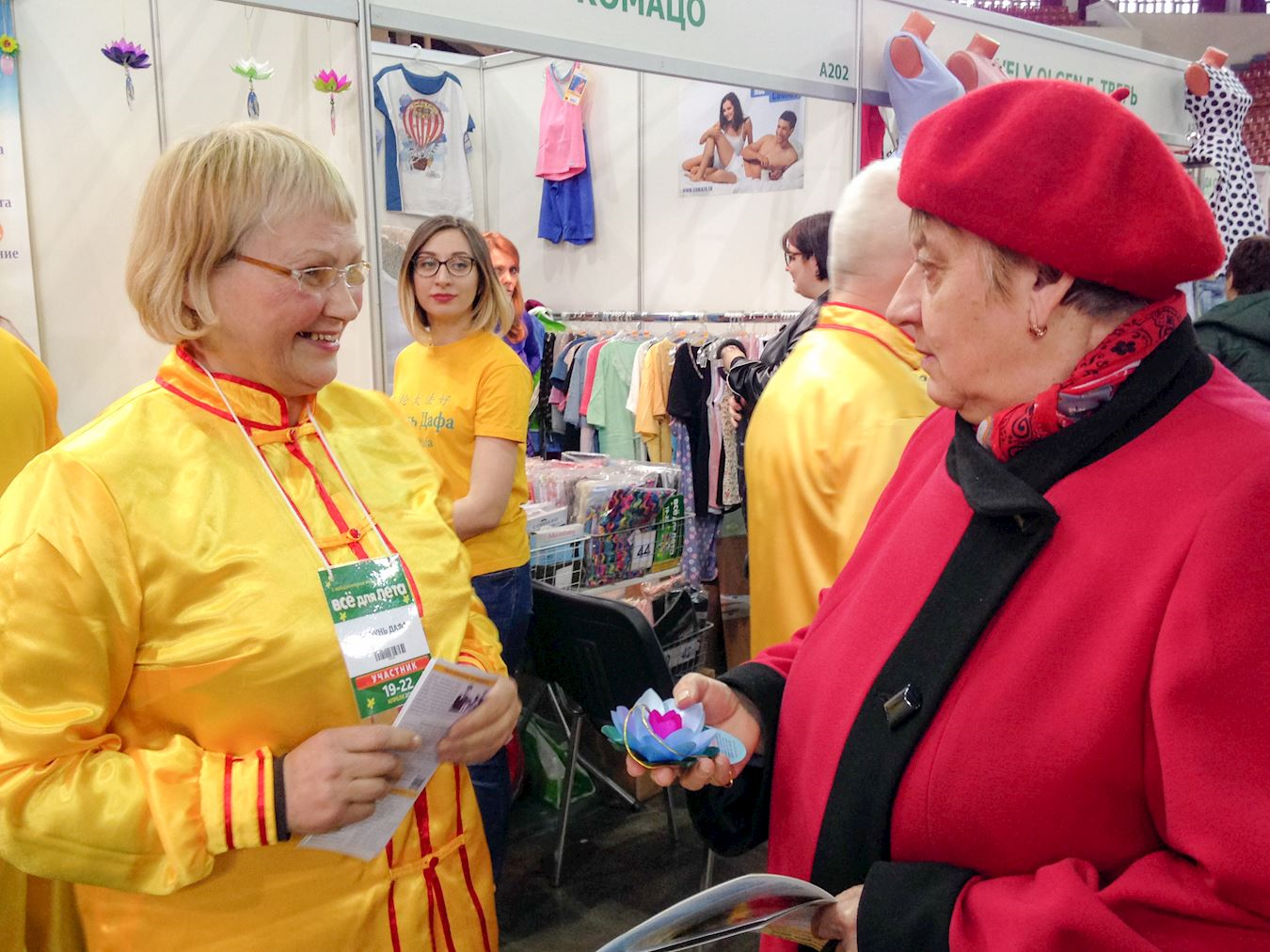 加莉娜(Galina)和朋友一起来参加展会,她以前听说过法轮功,但这是第一次看到。她表示自己被从学员身上感到的团结和温暖所震撼,她觉得法轮功学员传播真相的努力非常好。听说了在中国发生的迫害后,两位女士都深表同情,并祝法轮功学员们反迫害成功。