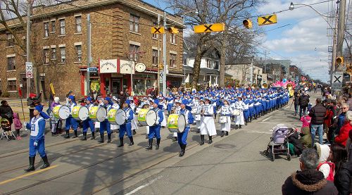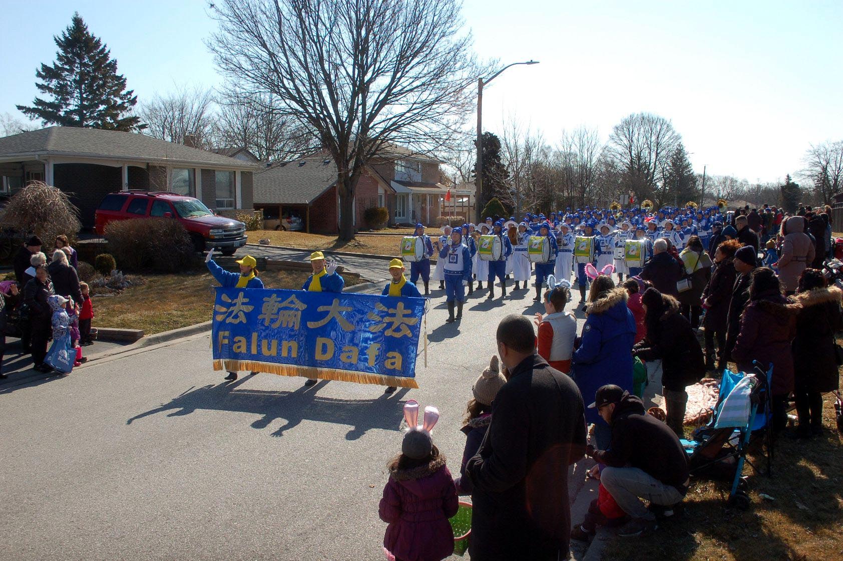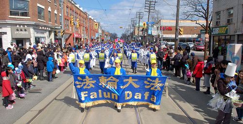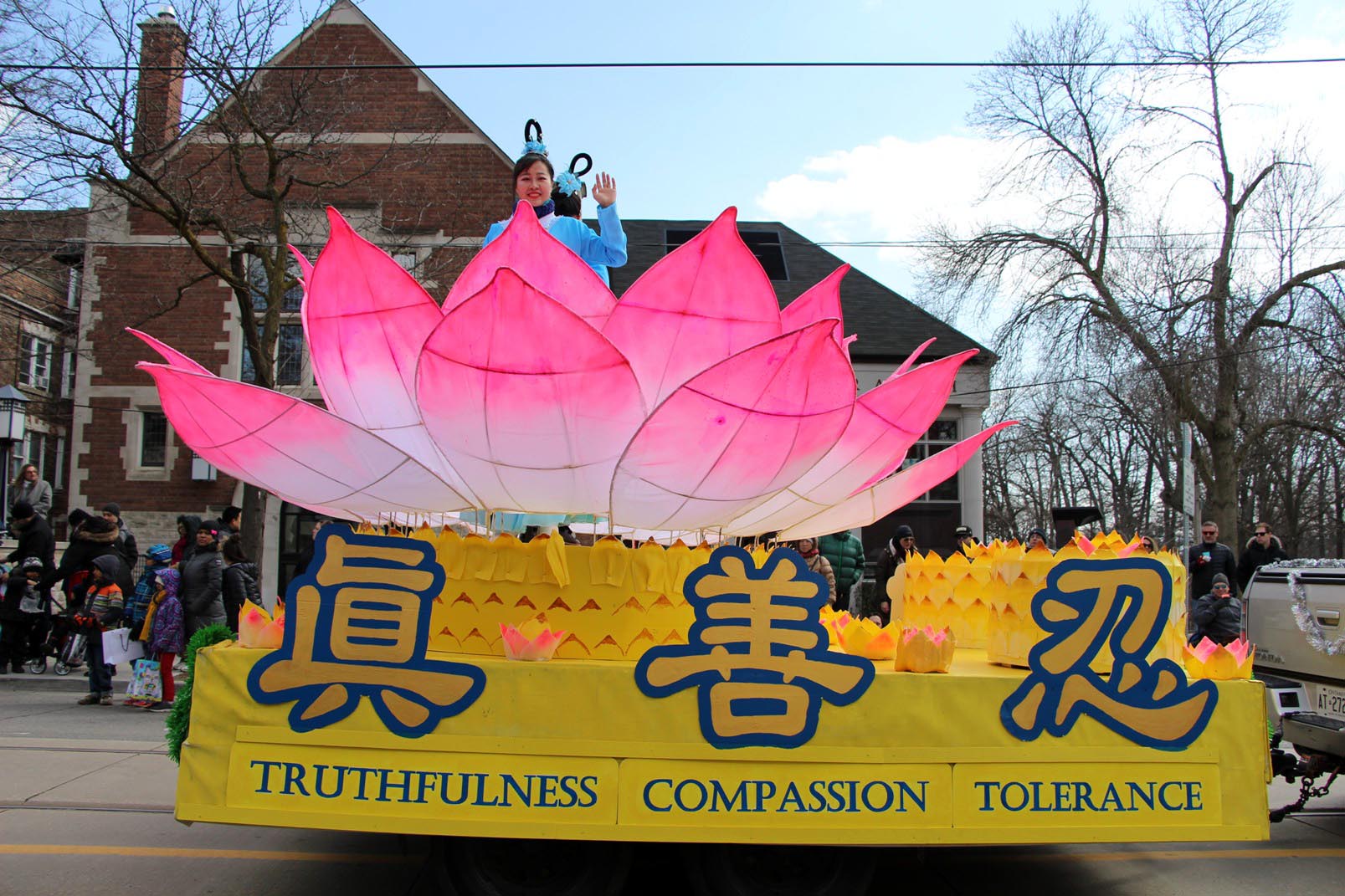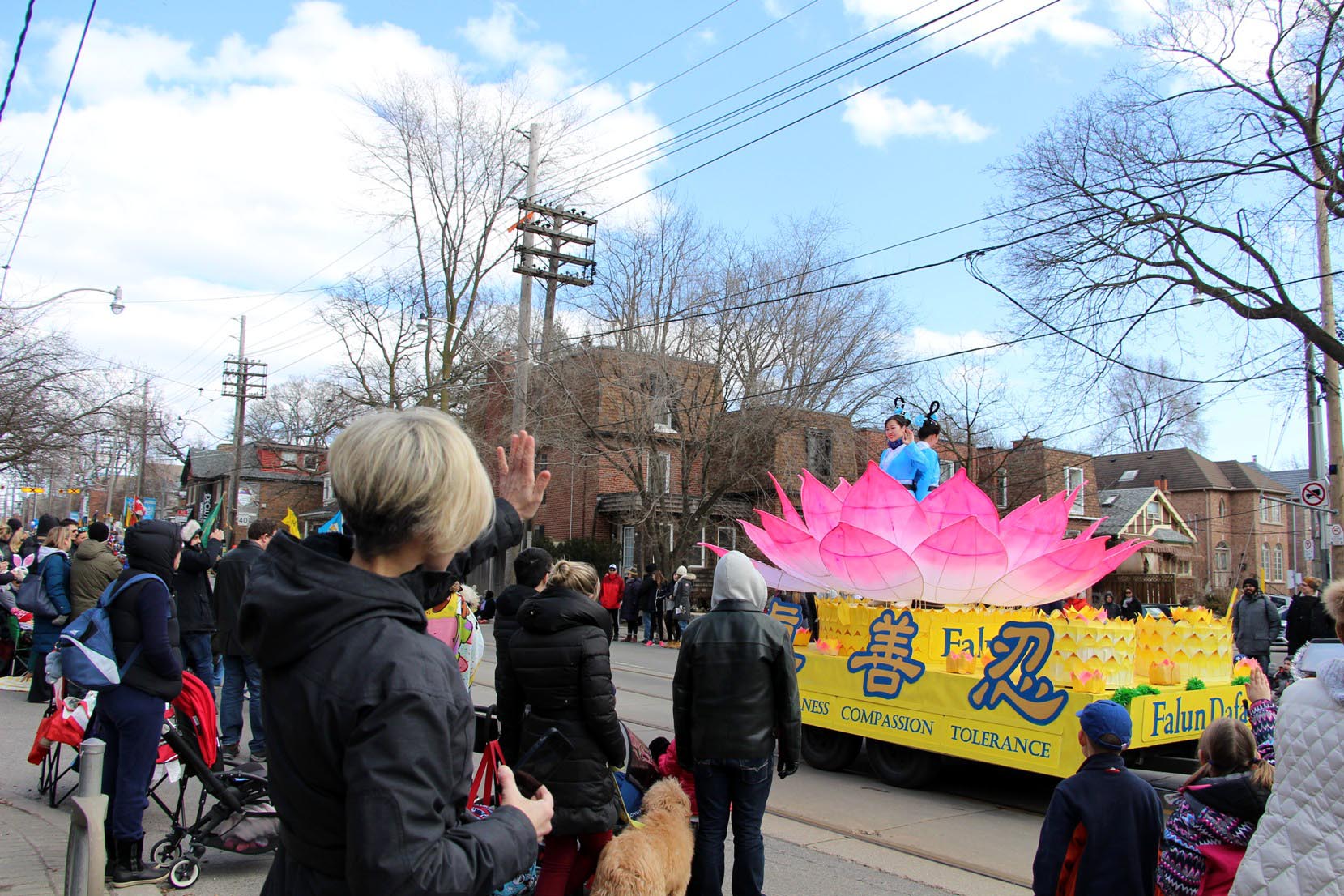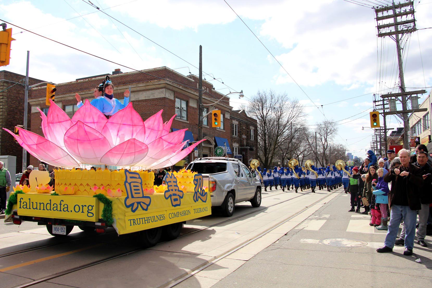 由多伦多法轮功学员组成的天国乐团、花车和腰鼓队应邀参加了游行,有华人观众赞法轮功队伍给人们带来美好的展现;有西人观众赞法轮功的队伍给人们带来春天的感觉。