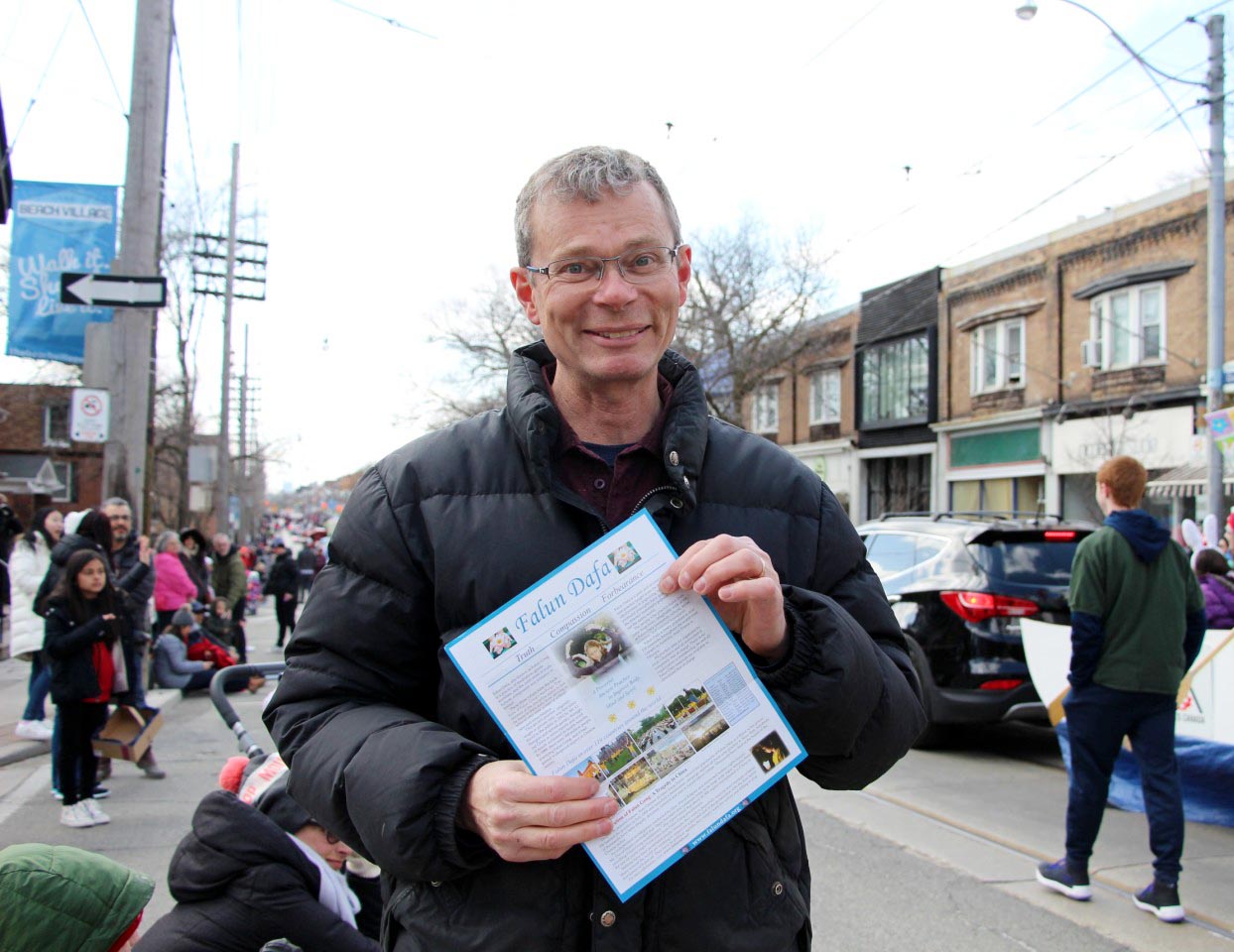 多伦多居民克林特(Clint)和他的朋友们在观看游行,跟着天国乐团的乐曲欢呼和起舞,他说:“我们每年看到他们的到来都非常兴奋,大家都很喜欢他们,你看人们都在为他们欢呼,因为他们给人们带来的是振奋和喜悦。当得知这个团体在中国是受到迫害时,他慎重地接过传单说:“是吗?为什么?谢谢让我知道这个信息,我一定要了解一下为什么这么好的一个团体会被镇压。”他拿着传单不停地说:“谢谢!谢谢!”