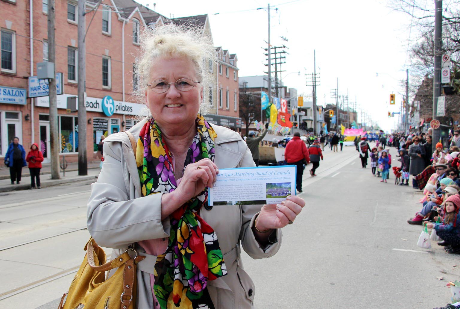 多伦多复活节游行的协调人卡罗尔·麦卡格(Carol McCague)女士说:“法轮功的天国乐团已经很有名了,感谢他们每年的到来,我非常喜欢他们,今年给我的惊喜是他们穿了古装,非常壮观,还加了一个仙女的花车,非常绚丽。”