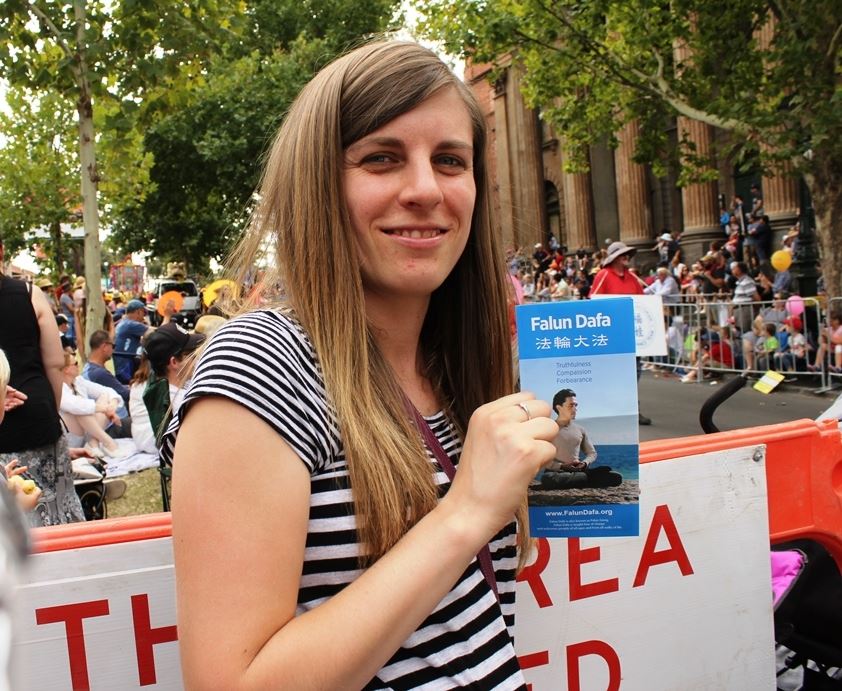 梅尔休伊什(Laura Melhuish)在当地本迪戈银行担任会计,她表示,身为基督徒,对法轮功学员传播这样的价值观非常感佩,“我真的感受到他们发出的正的能量。”她说,“我是基督徒,我认为真善忍是非常重要的品质,特别是在当今的社会,所以传播这一理念意义重大,非常了不起。”