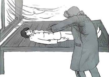 ![]() 示意图:冬天,在没有暖气的严管室里把窗户打开,往法轮功学员被褥上泼凉水,扒掉棉衣棉裤,只穿单衣服笔直躺在木板上 |