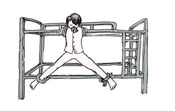 9)两个胳膊掰后面绑上,背对上铺梯子嘴用枕巾堵上并把头绑梯子上,腰用裤子也绑在上铺的梯子上,长时间站立;