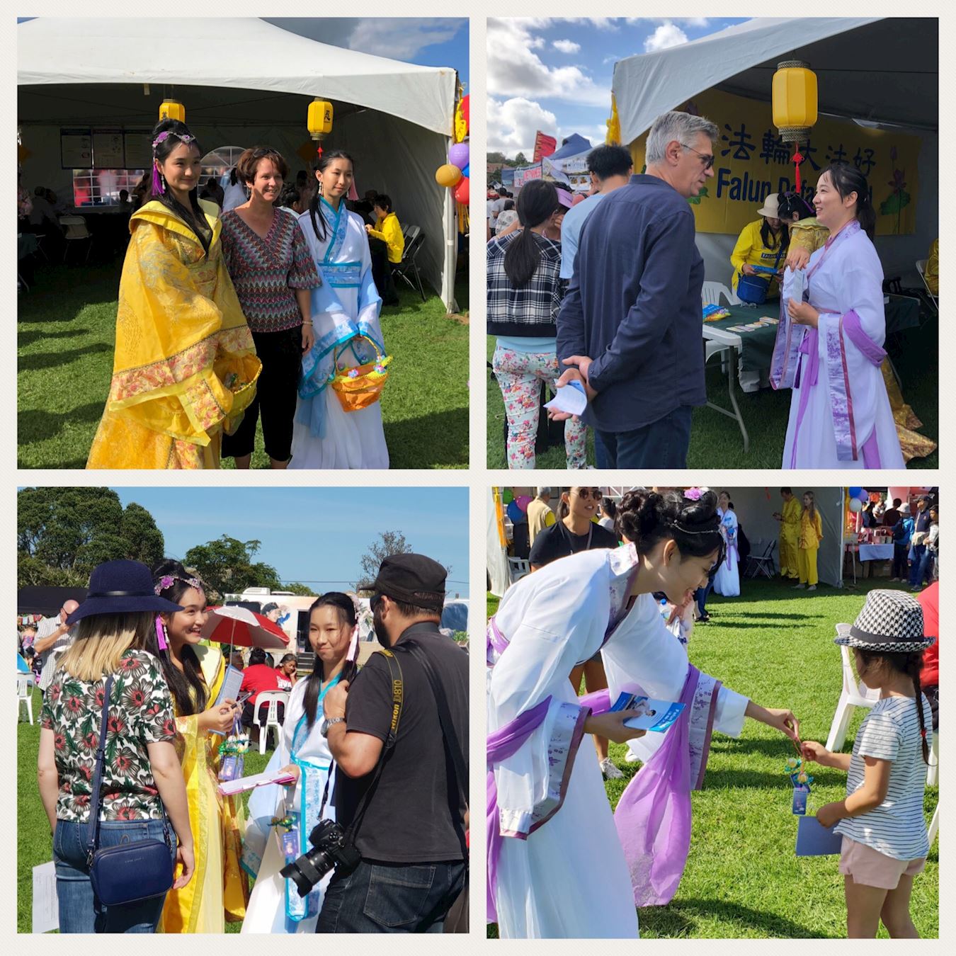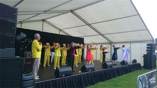 法轮功学员们应邀参加了这个一年一度的文化节,在文化节的舞台上表演了腰鼓,还展示了五套功法。腰鼓表演赢得了阵阵掌声,优美祥和的功法展示,让人们不禁在台下学炼。法轮功学员介绍中国文化的展位上,更是人来人往,有学折莲花的,有学剪纸的,有咨询中医中药的,还有不少人了解真相后,要学法轮功的。