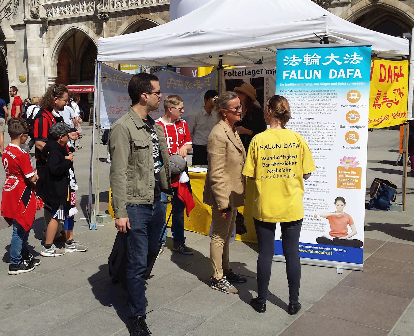 ![]() 图:法轮功学员在德国慕尼黑市中心玛利亚广场上传播真相 |
