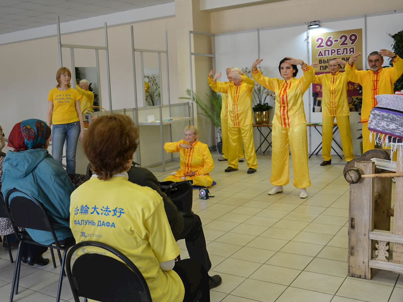 许多人都被展位上的信息展板吸引住了,上前仔细询问,第一次听说的人,对如何通过炼功恢复健康很感兴趣。而后学员们集体展示五套功法动作。优美的炼功音乐、舒缓的动作和娓娓道来的解说更吸引了很多人观看。展位的隔墙不高,所以整个展厅基本都能看到。