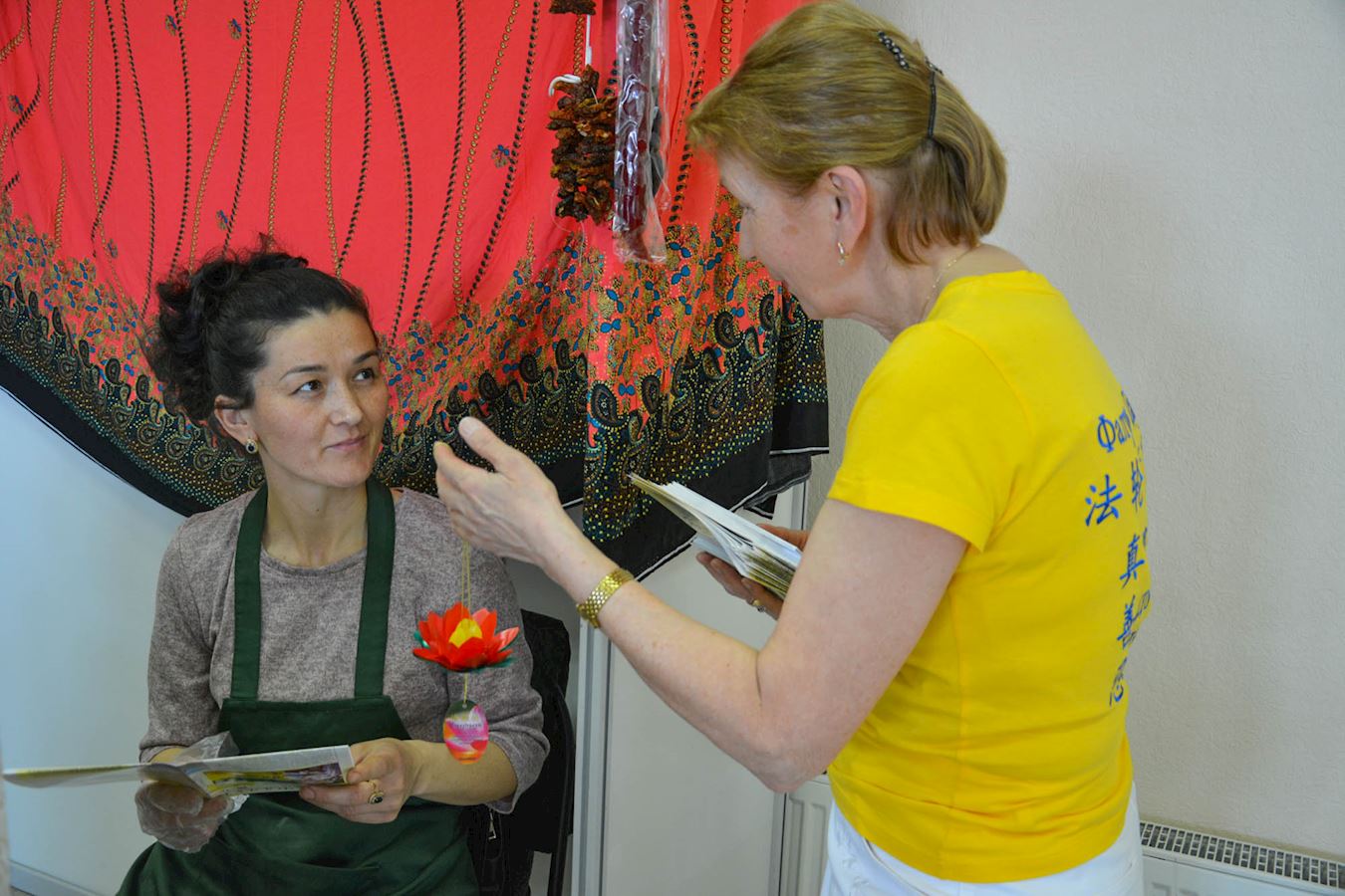 过后,一些人向学员详细询问自己的修炼体会。一位女士表示观看法轮功学员的功法展示后不想离开,感觉到了从学员身上散发出的强烈的善的力量。一个来自吉尔吉斯名叫艾伊(Ai)的年轻姑娘很认真的观看功法演示,并在记事本上记录下学功地点。一位名叫弗拉基米尔(Vladimir)的男士,听了学员的讲述后,提出了很多问题,并且说到自己在思考人生的意义,曾深入研究了哲学问题,知道了在中国对法轮功学员的迫害后,表达了对中共邪恶迫害的谴责。来自亚美尼亚的卡琳娜(Karina)学过很多修炼的方法,对真、善、忍宇宙法理很感兴趣,记下了网站地址,说要更好的了解一下。