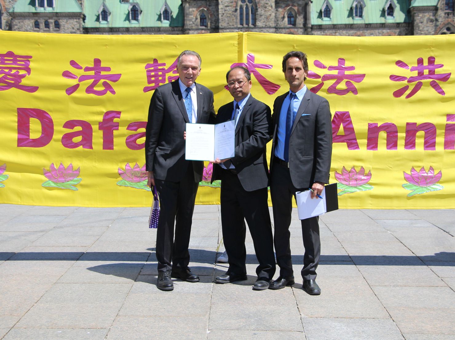 国会议员Peter Kent先生在上午的发言开始时就用中文说:“你好!法轮大法好!”这么多年的反迫害中,每年的集会Peter都到场支持并发言。上午到场发言后,下午学员们在集体录像和拍照给法轮大法师父恭祝师父生日快乐时,他从新来到学员中,问是否可以跟学员们合影,他要放到他的脸书上。