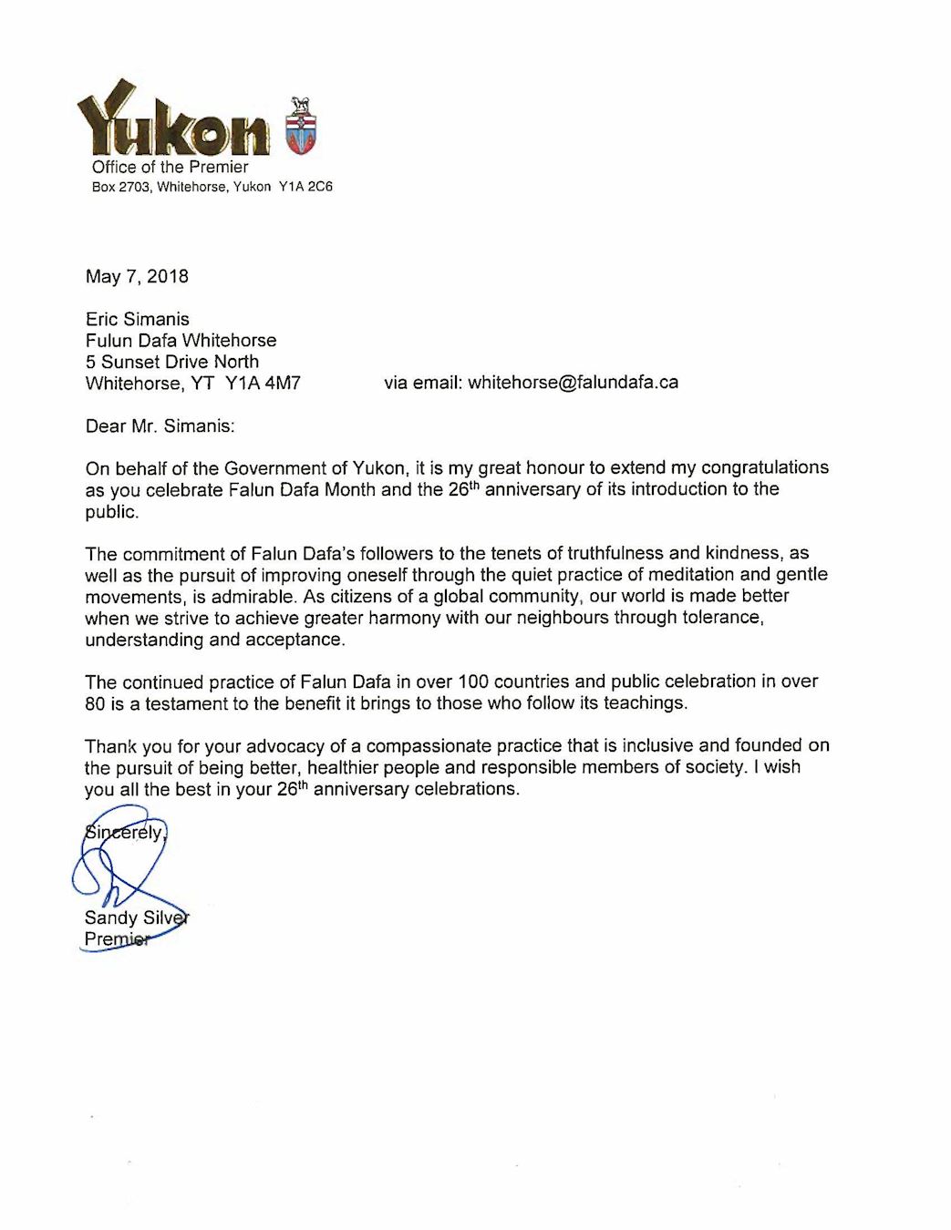 五月十三日是“世界法轮大法日”,二零一八年是法轮大法洪传世界二十六周年,在世界法轮大法日前夕,这个几近北极圈的育空地区省长桑迪银·希尔福(Sandy Silver)和育空地区国会议员莱瑞·巴格内尔(Larry Bagnell)发来贺信,祝贺法轮大法弘二十六周年,颂扬法轮大法“真、善、忍”的理念,感谢法轮大法修炼者为社区带来美好。