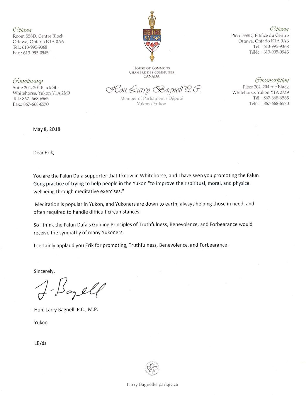 ![]() 图4:育空地区国会议员莱瑞·巴格内尔贺信 |