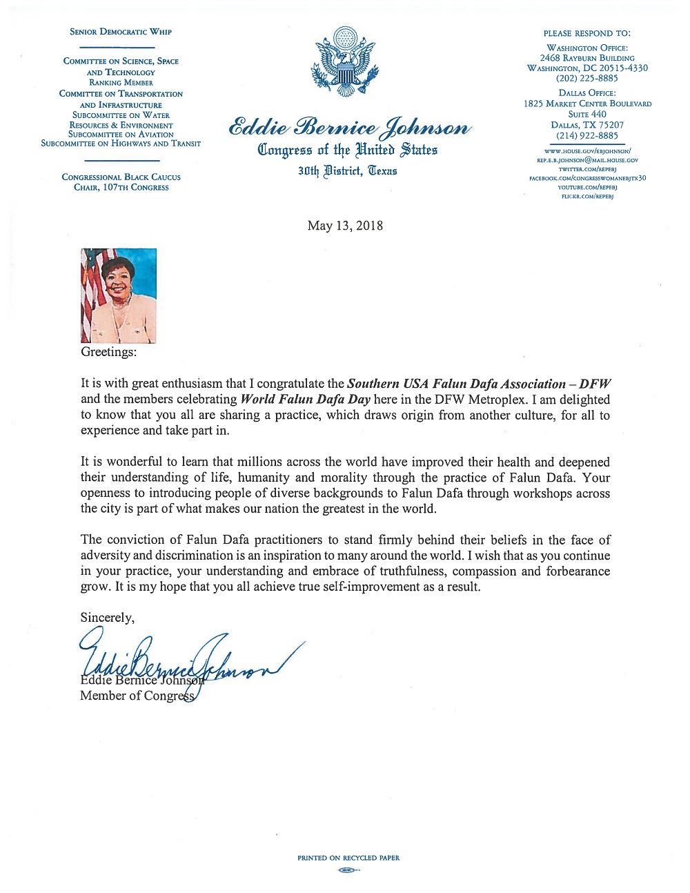 德州第三十选区女国会议员迪·强生(Eddie Johnson)在信中说:“非常高兴地了解到通过修炼法轮大法世界上百万的人们改善了身体的健康,更使他们对生活、人性和道德的认识有了升华。你们通过各种教功把法轮大法介绍不同背景的人的开放态度,这是使我们的国家成为世界上最伟大的国家的一部份。”
