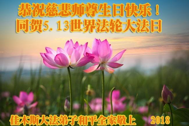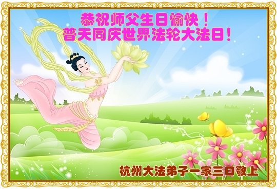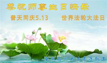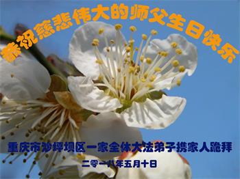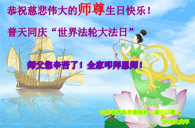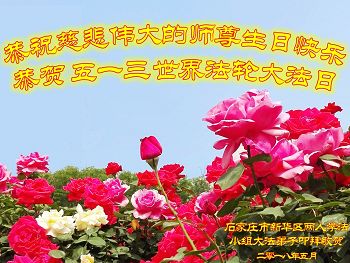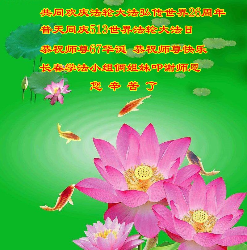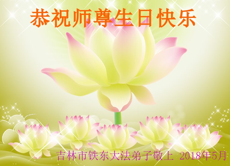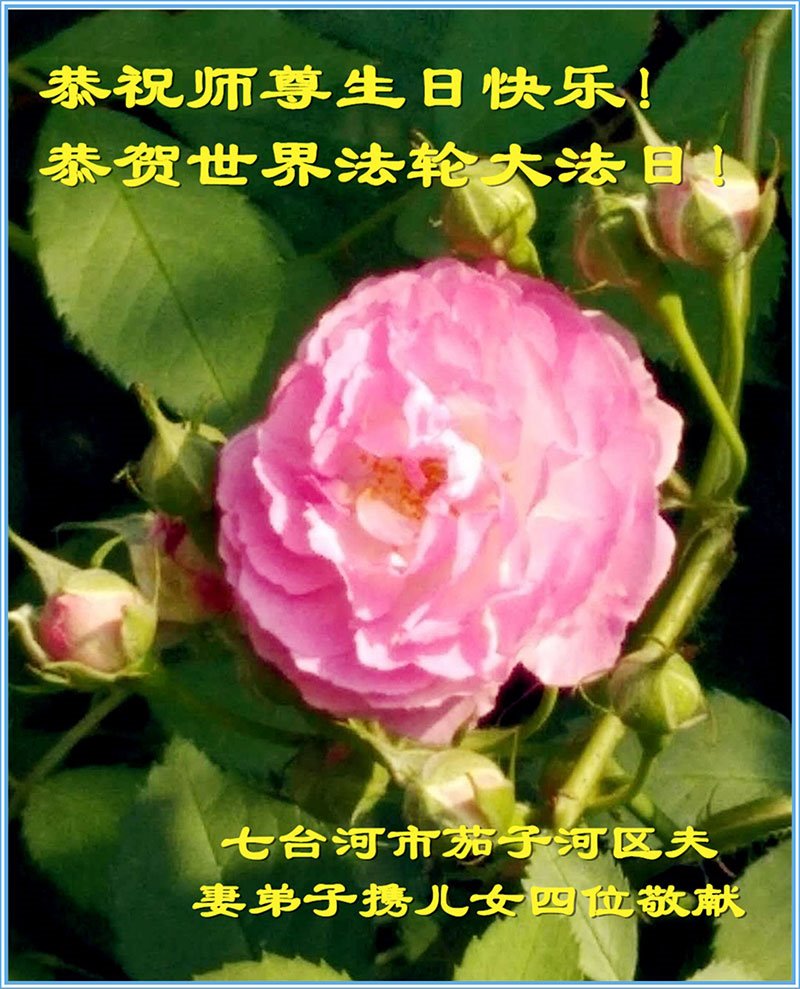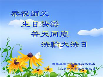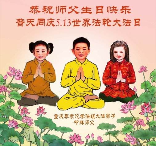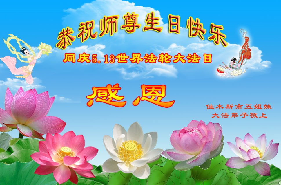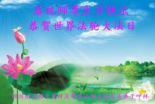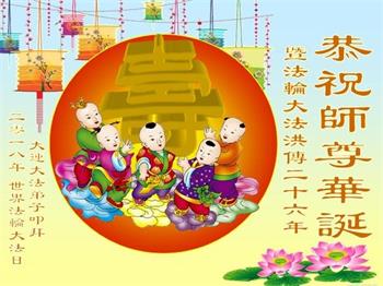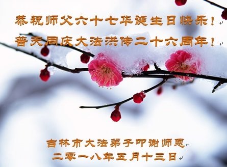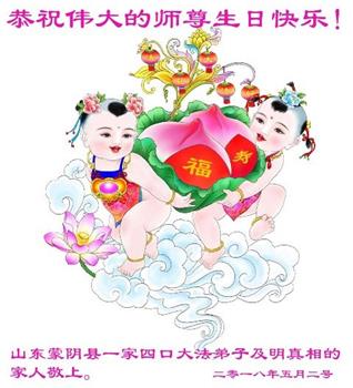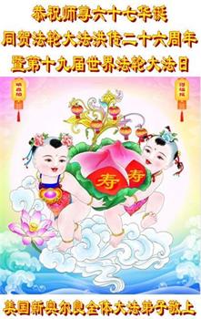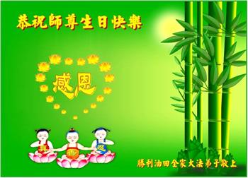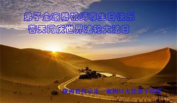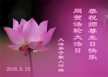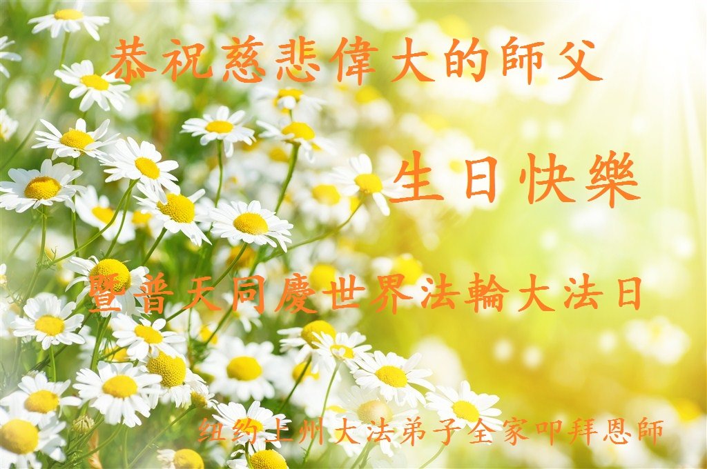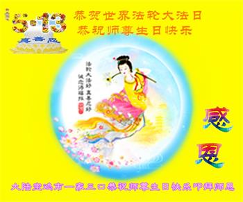 马上就到法轮大法日了,在此普天同庆的时刻,纽约上州大法弟子一家四口恭祝慈悲伟大的师父生日快乐。弟子一家谨记师父的教诲做好三件事,加倍弥补以前没做好的损失,走好以后的路请师父放心。