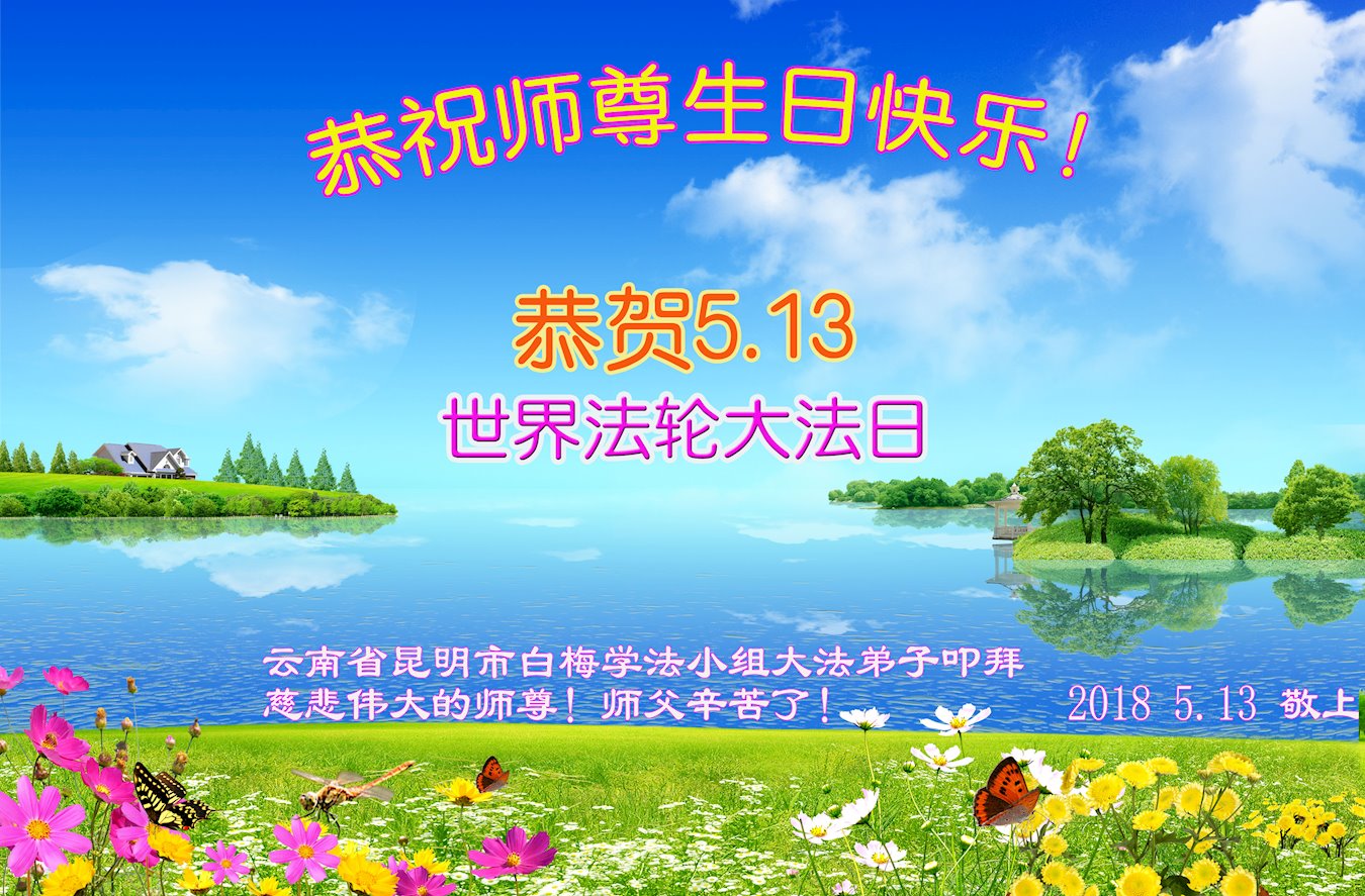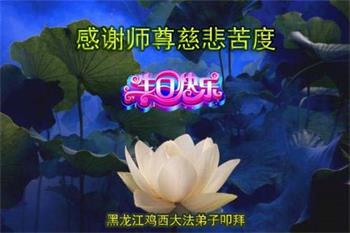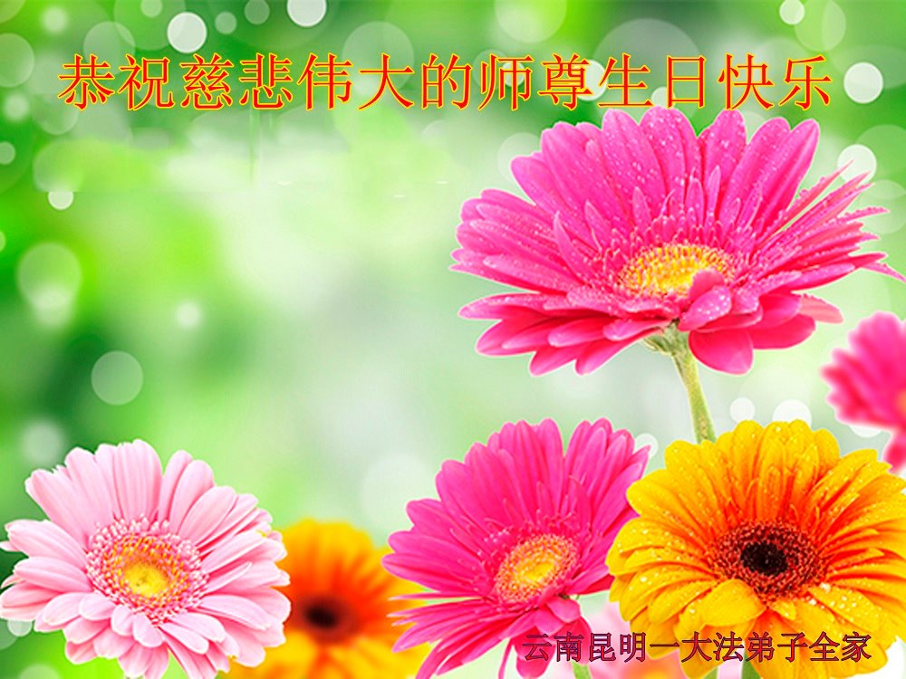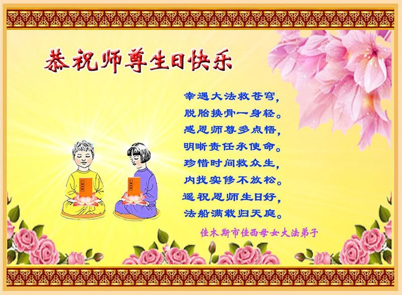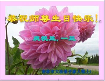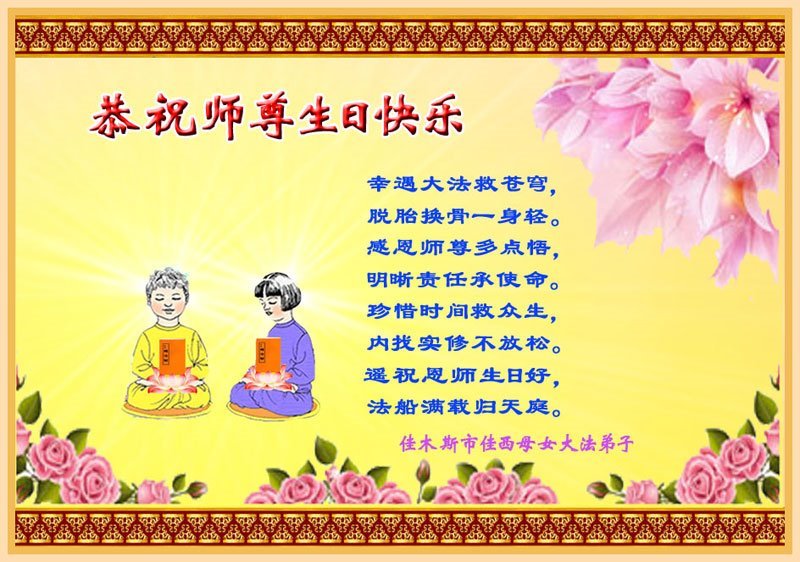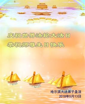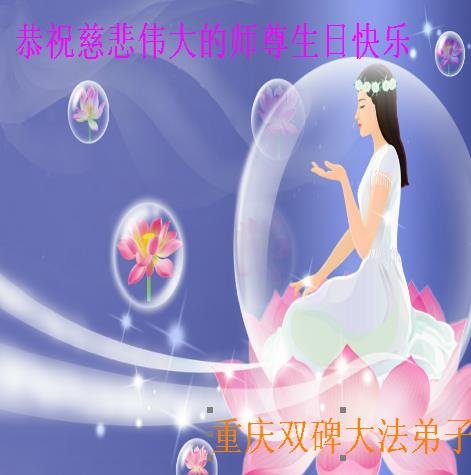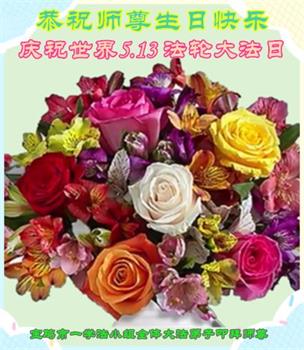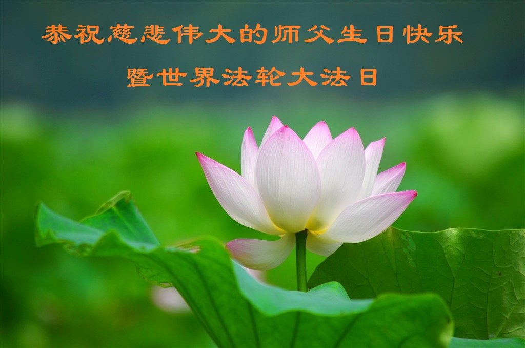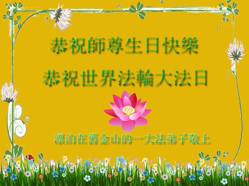 弟子恭祝师尊生日快乐!恭贺世界法轮大法日!修到如今弟子终于明白了师尊的良苦用心,无论是碰到的好事还是坏事都是在帮助弟子修去各种不好的人心,师尊的无量慈悲弟子感受到了,弟子体悟到了改变观念向内找的内涵,学会了修炼。不断纯净自己,认真做好自己所承担的大法救人的项目,抓紧时间多救人。在师尊华诞之际弟子再次叩谢师尊!弟子恭祝师尊生日快乐!旧金山一大法弟子