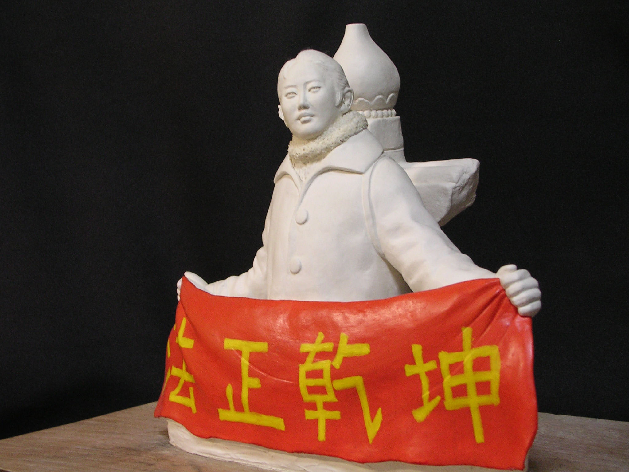 注:作品的灵感来自真实发生的事件。一九九九年七月,中共江氏一伙发动了对法轮功的残酷迫害,诬蔑法轮功的谎言铺天盖地。那时,成千上万的法轮功学员怀着善心去北京天安门广场,希望向世人、向全世界说明法轮大法是正法的真相,他们当中有一位女性法轮功学员,在天安门广场打出了一条横幅,上书:“法正乾坤”。