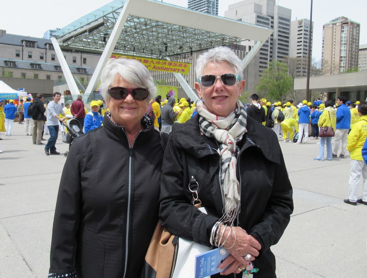 来自哈利法克斯市的Bea Bardsley女士是一名保险经纪。她和姐姐退休汽车经销商Mary Macarkur经过广场,看到法轮功学员的歌舞表演非常喜欢。她说:“演出美极了。”她说:“看得出来,真善忍的理念让人们拥有平和的心态。”看到法轮功学员打坐炼功的场景,她说,打坐修炼可以让人找到内心真实的自我。她表示,回到哈利法克斯后,她要好好了解法轮功。她的姐姐Macarkur女士说:“今天的演出美好极了,有很多年轻人。服装也非常美好。”