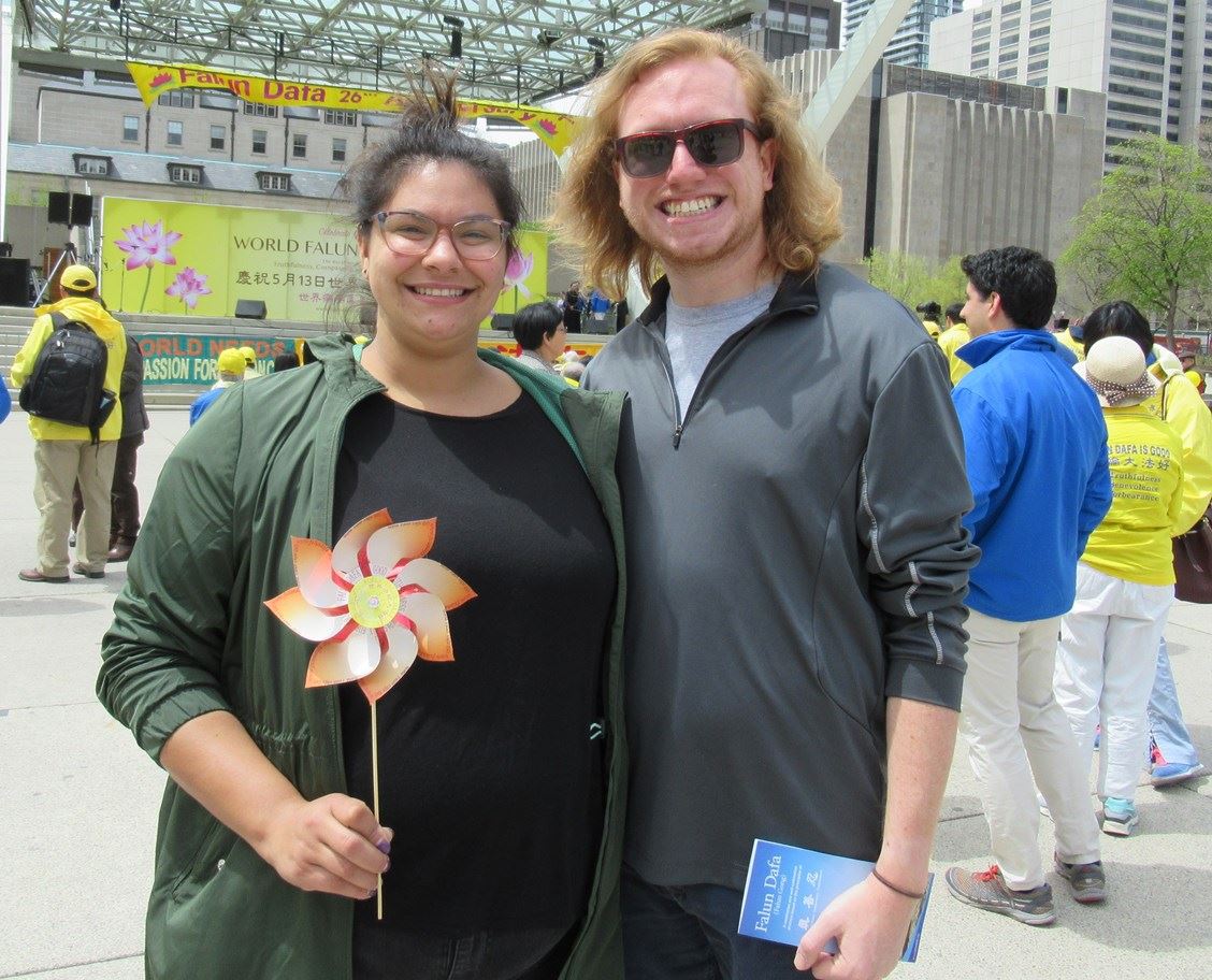 在广场的活动中,住在市政厅附近的Richard和 Jason,来到现场听法轮功学员的介绍后,非常感谢。Richard说:“我们就住在隔一条街的地方,这里的活动把我们吸引来了,这里的能量场很强,我们了解到了很多的情况,知道了法轮功是一个非常好的功法,今天的活动非常精彩,我们还知道他们都是在义务的做着这些事。不幸的是他们在中国是受迫害的,他们能在自由的加拿大展现法轮功的美好,给人们带来欢乐和祥和,真的非常感谢。今天的活动很好,来了这么多政要支持真好,媒体应该都来报道,让更多的人发声和支持,呼吁停止迫害。”