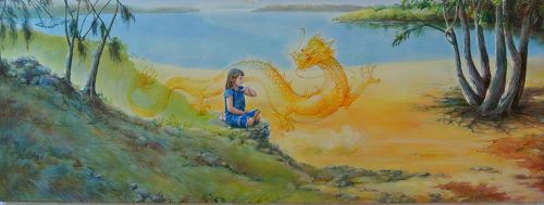 说明:一个法轮功小弟子正在打坐(法轮功的第五套功法——神通加持法),一条龙正在看护着她。当我们感到被保护或非常幸运时,我们会说有“守护天使”在看护我们,在东方,守护神有很多种,其中包括龙。但东方的龙和西方的龙并非同一类生命,西方的龙通常是可怕和凶恶的,但东方的龙也可能是正的力量。