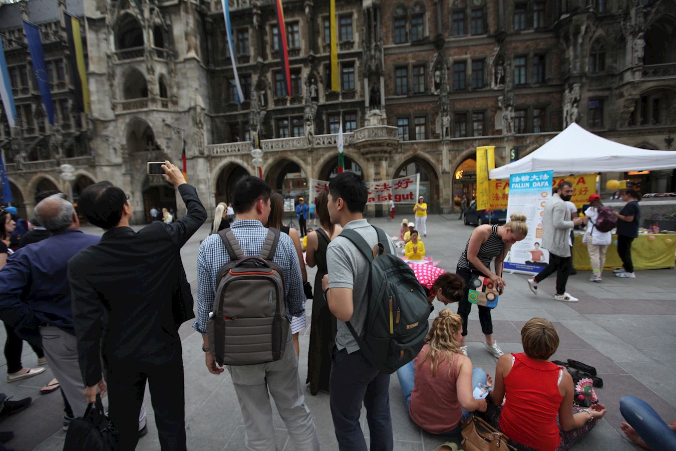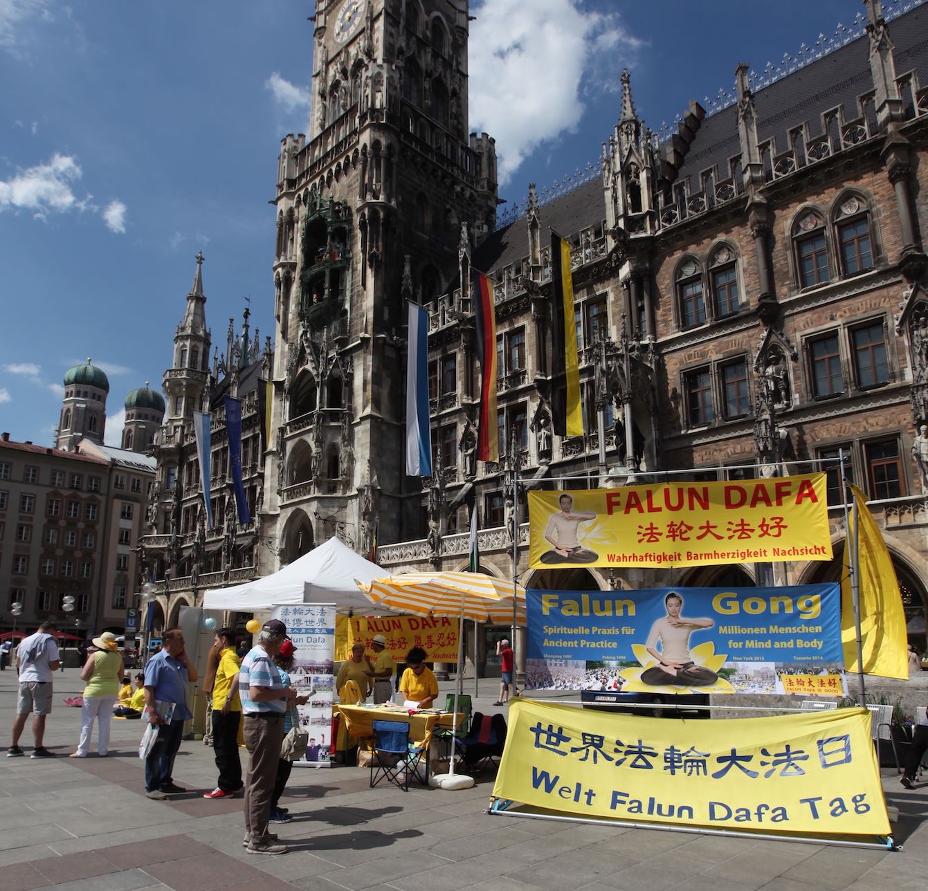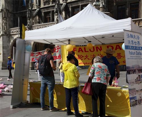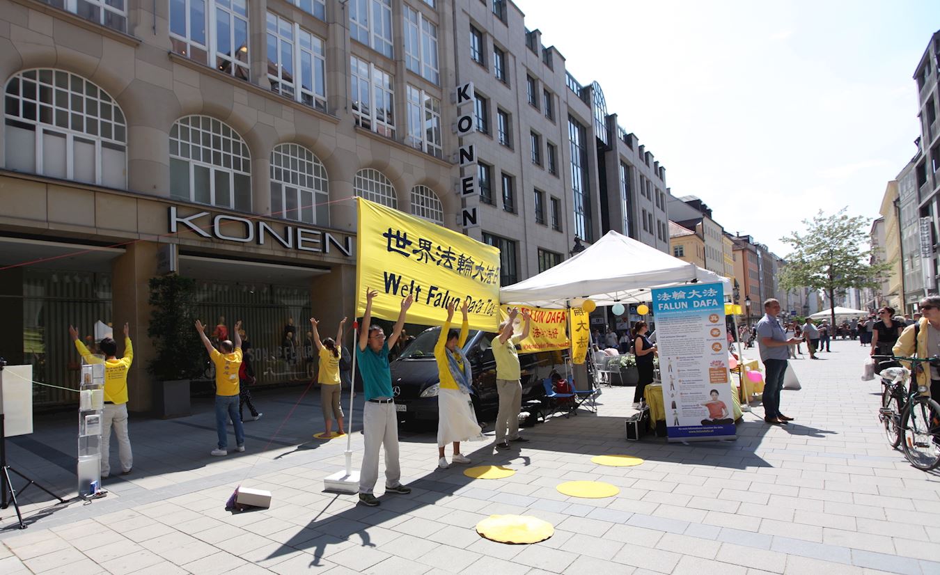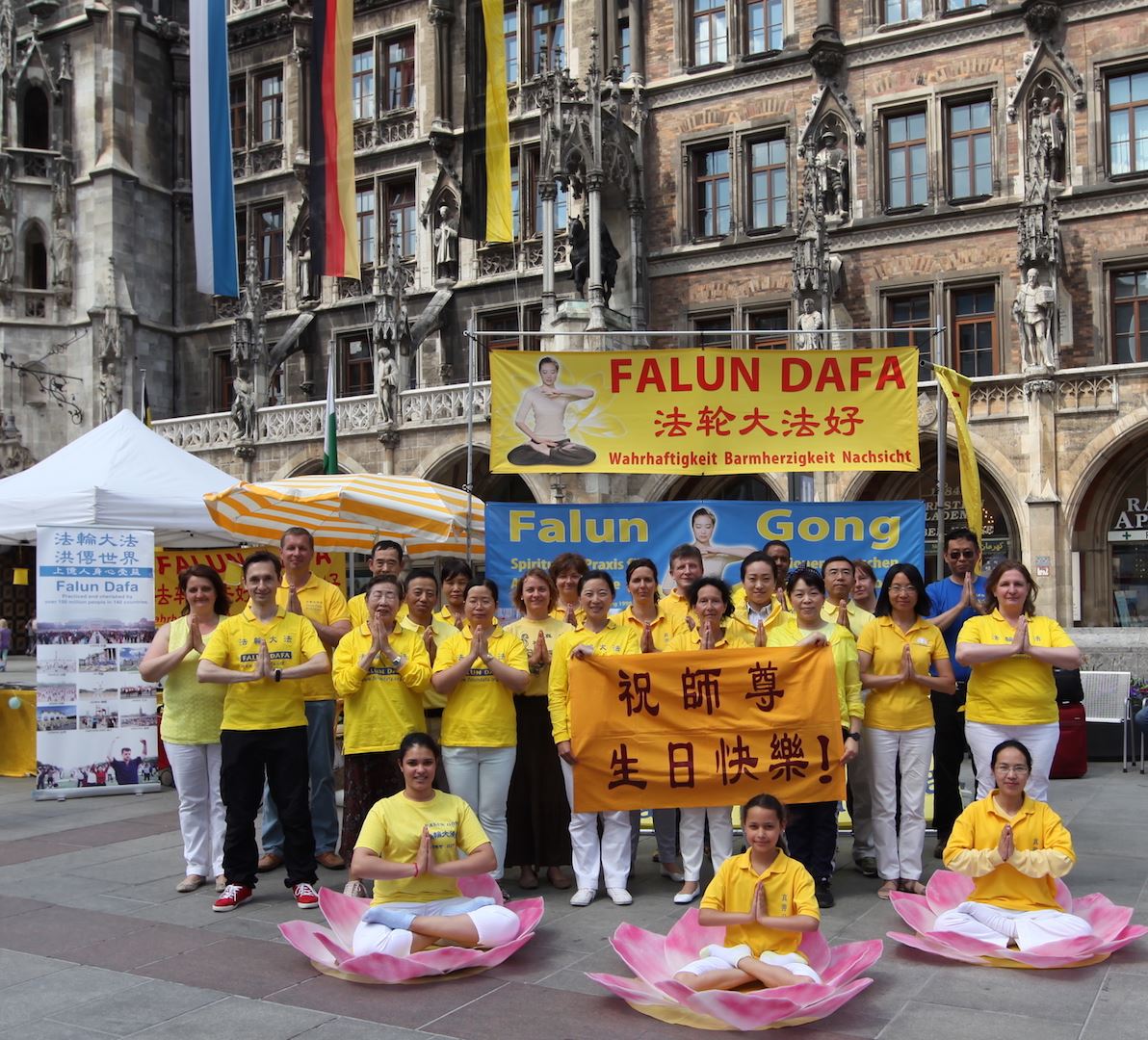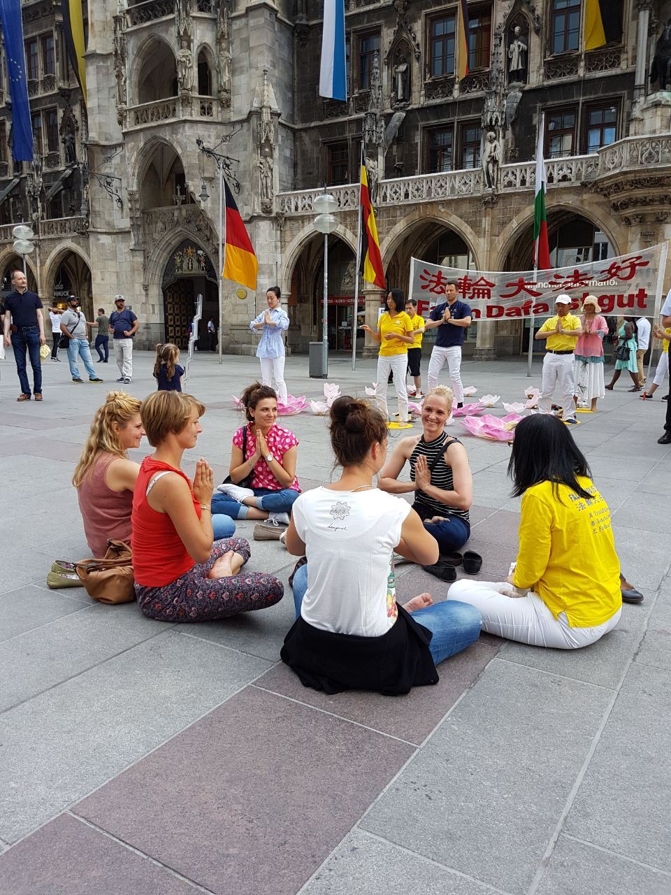 五月十三日,法轮功学员在慕尼黑的玛琳广场(Marienplatz)举办庆祝活动,学员们坐在莲花里,随着悠扬的炼功音乐展示功法演示,让不少民众着迷,不少人打听慕尼黑的炼功点,有些人更是当场就跟着学炼法轮功。