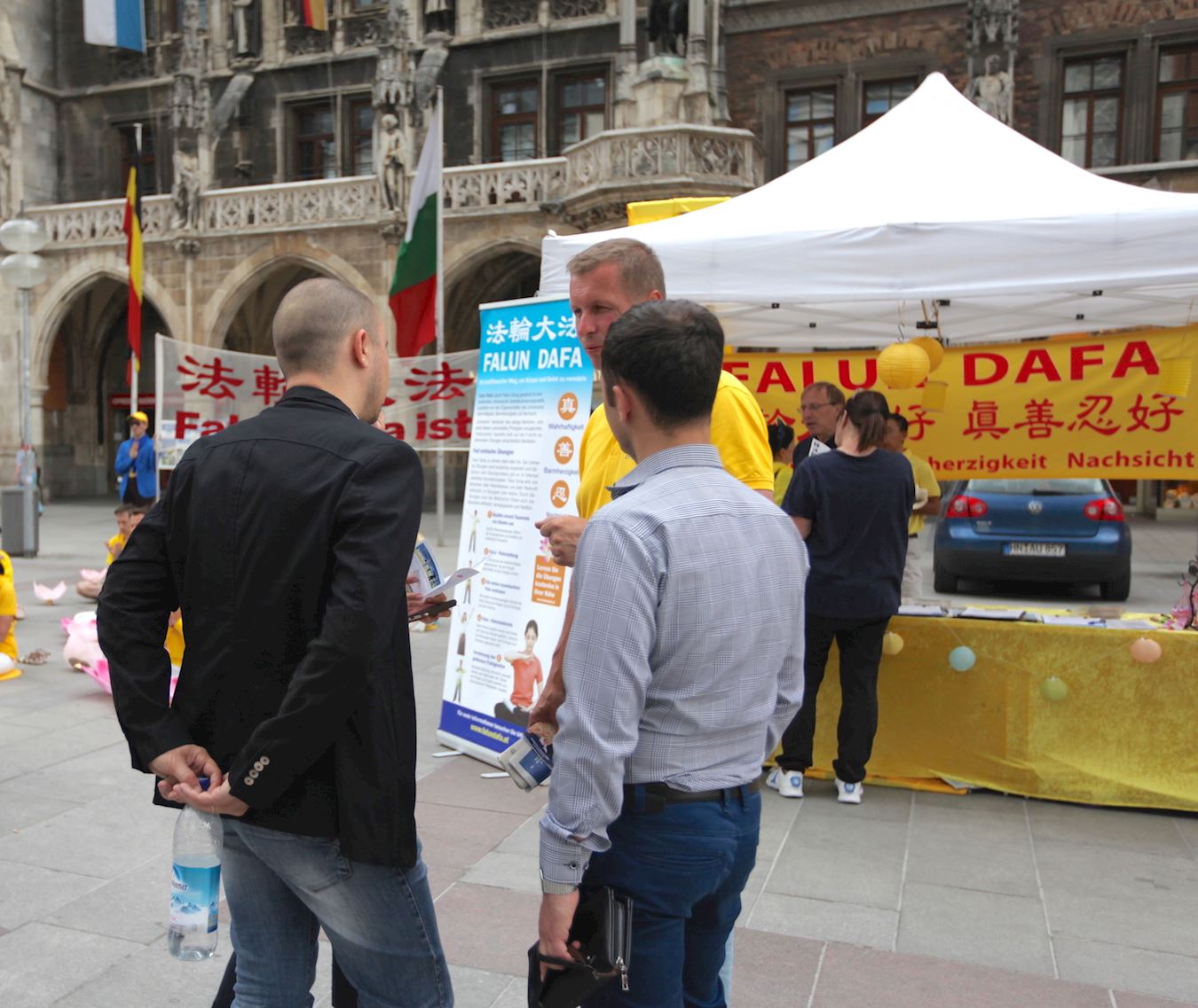 一位来自德国黑森州的男士跟法轮功学员交谈了很长时间,他说自己来自一个小镇,镇上的民风相当朴实。相对当今社会对经济和物质欲望的追求,镇上的人还保持着对神的信仰。“信仰非常重要,没有了信仰,还要怎么活下去。”当他了解到中共对法轮功学员的迫害,觉得很悲哀,对法轮功学员能够在被迫害的情况下依然能坚持信仰这点很赞赏。