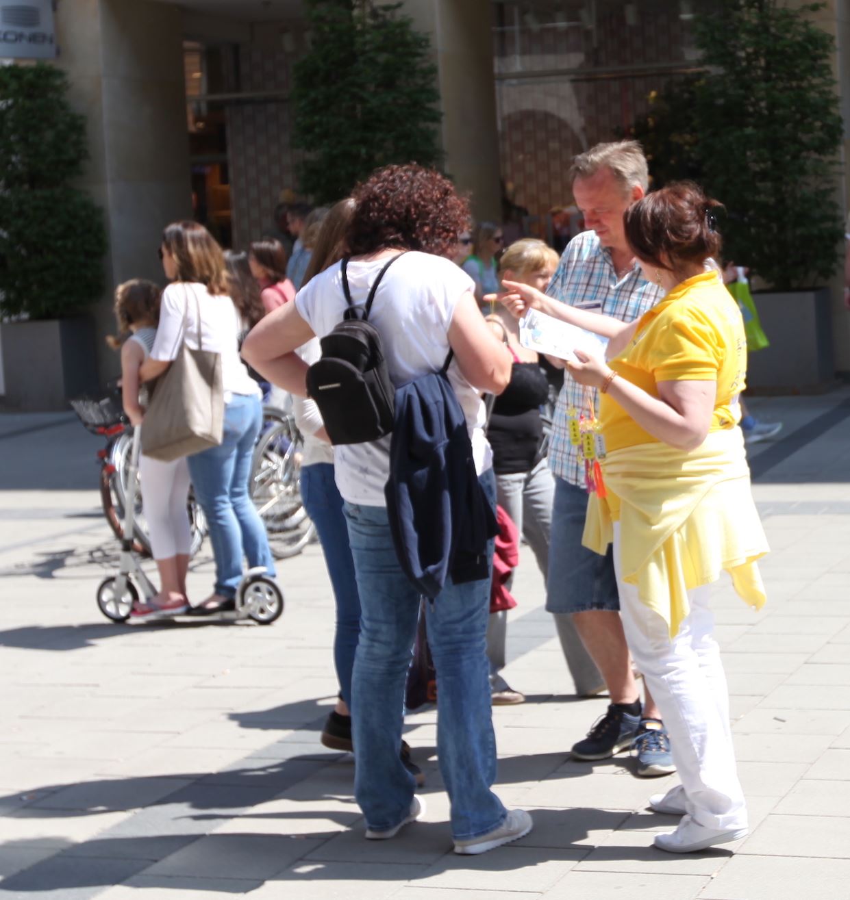 五月十二日,来自巴伐利亚和奥地利萨尔茨堡的法轮功学员在慕尼黑步行街森德林根大街(Sendlinger Strasse)举办庆祝活动。当天同样有不少人询问炼功点的信息,签名制止中共迫害法轮功。也有路过的中国民众当场表示退出中共组织。