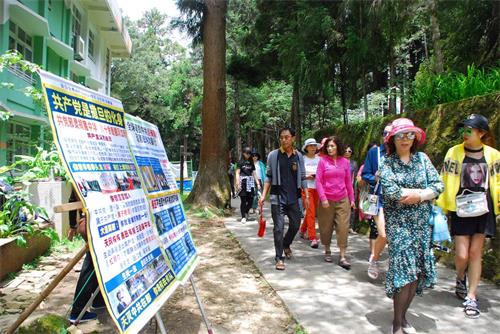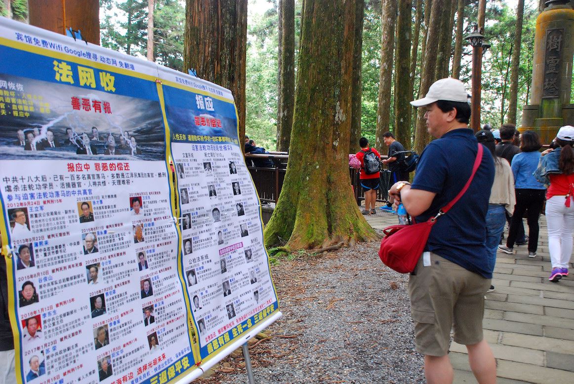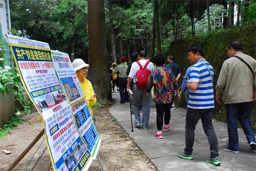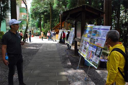 学员们长期坚持在阿里山博物馆讲真相,一位学员向站在真相看板前的大陆遊客说,自焚案是造假欺骗老百姓,嫁祸法轮功。这位学员说:“自焚案发生时,公安马上拿灭火器灭火,哪一个公安平常会带着灭火器巡逻?”这位大陆遊客参加过少先队及共青团,学员告诉他三:退.可以保平安:“他了解真相后说要退,我就帮他退了。”