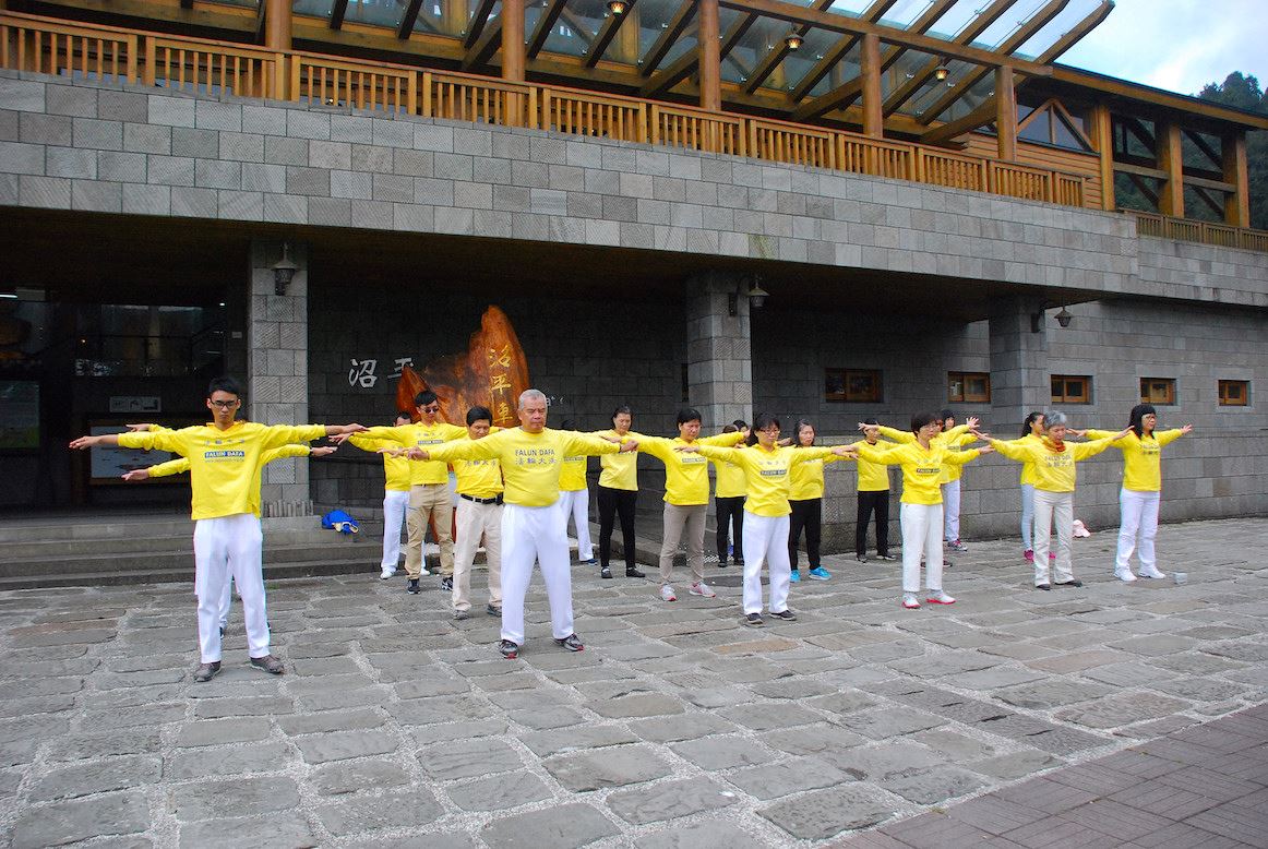 法轮功学员到热门景点受镇宫广场集体炼功,简单的功法动作,祥和的炼功音乐,吸引许多遊客停下脚步观看,也有跟着学员学炼动作。然后步行至沼平车站,沿路发放真相资料、纸摺莲花,向遊客讲真相,传达大法的真善忍。在沼平车站前炼功后,回到出发点阿里山车站继续炼功,在云雾飘缈的高山上演炼五套功法,展现法轮大法的美好。