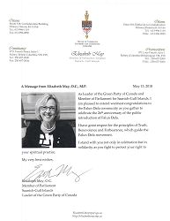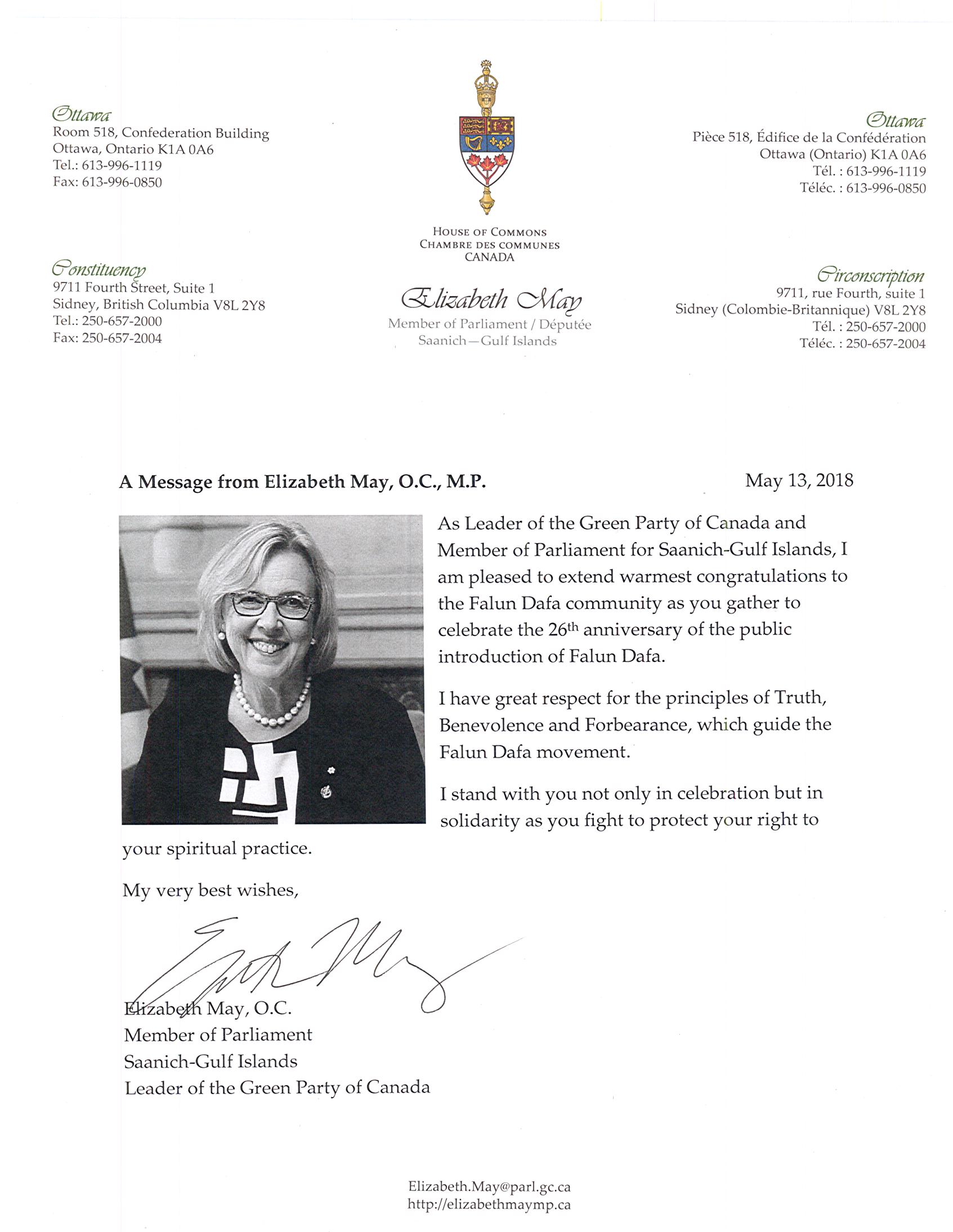 绿党领袖、卑诗省国会议员伊丽莎白·梅(Elizabeth May)发来贺信颂扬法轮大法,她在信中说:“在法轮大法洪传二十六周年之际,作为加拿大绿党领袖和Saanich—Gulf Islands选区的国会议员,向所有参加庆祝活动的人们送上我最诚挚的祝福。