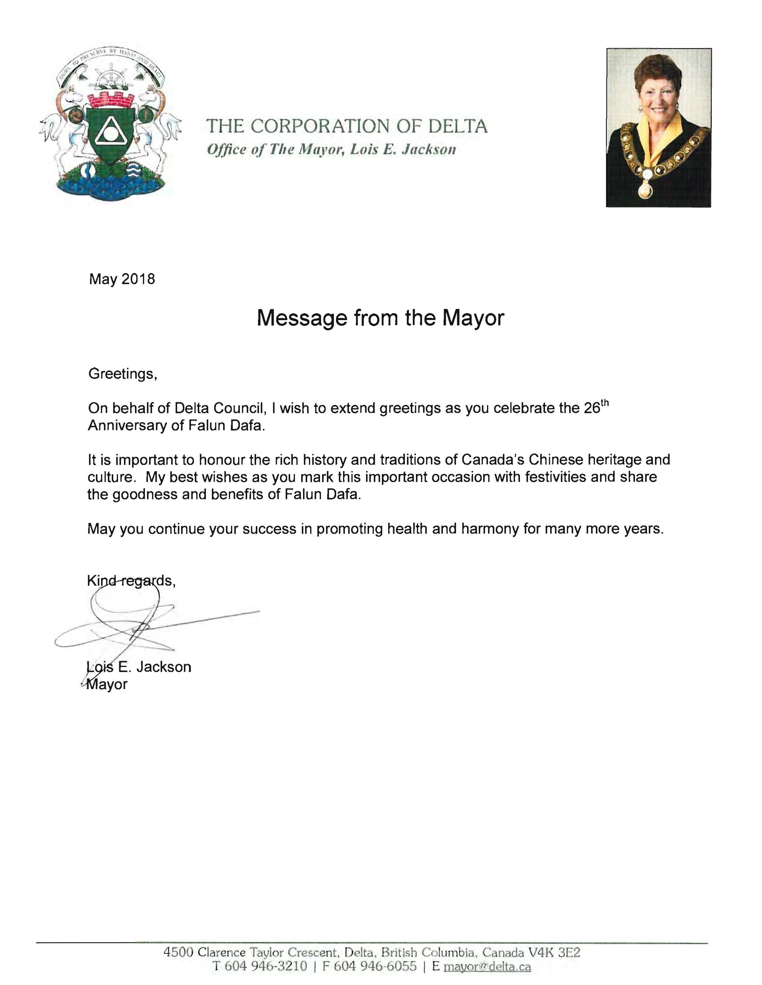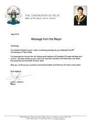 卑诗省三角洲市(Delta)市长露易丝·杰克逊(Lois E.Jackson )在贺信中表示: