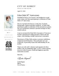 卑诗省素里市长琳达·赫普纳(Linda Hepner)在贺信中称颂道: “谨代表素里市(Surrey)议会,很荣幸向所有参加法轮大法传世二十六周年庆祝活动的人们表示热烈祝贺。
