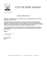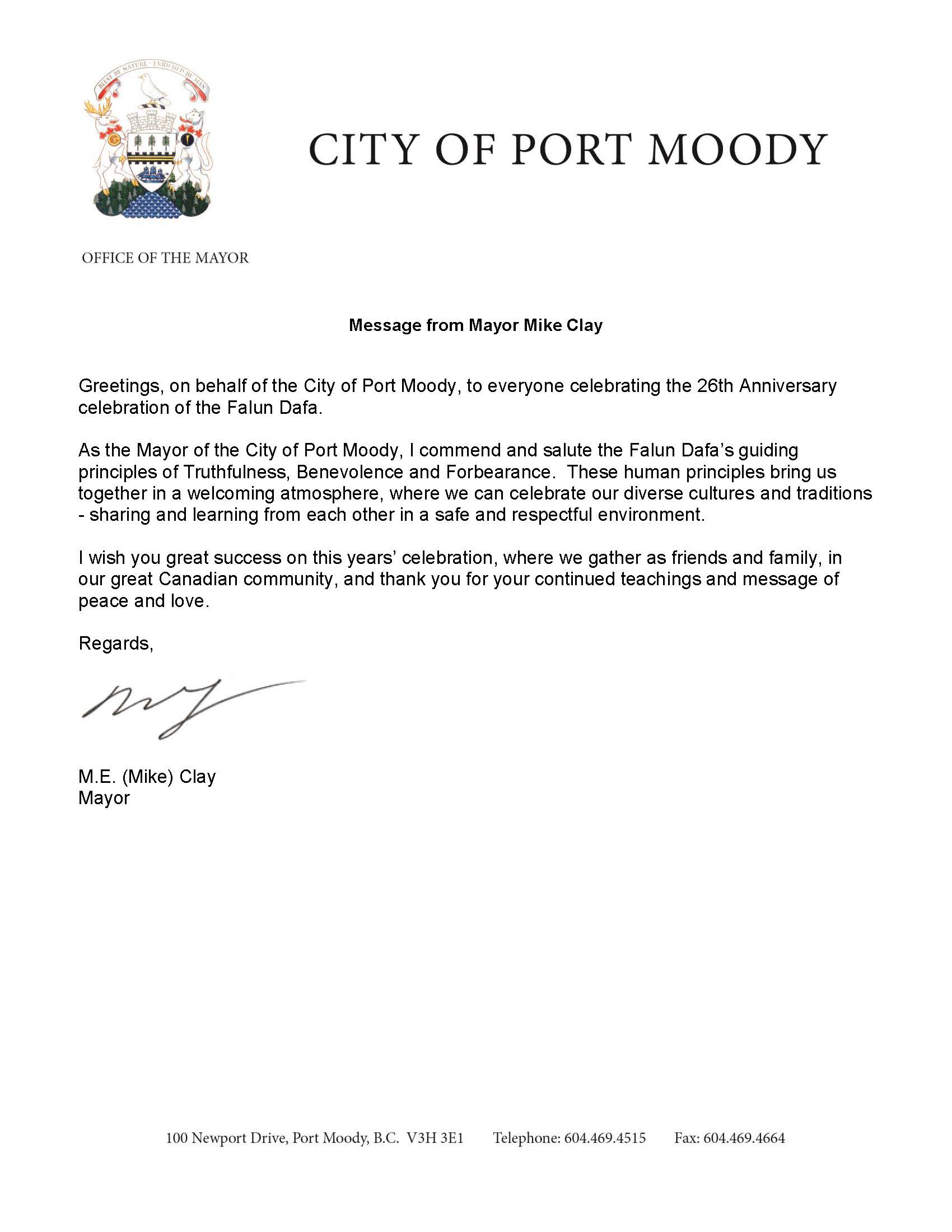 卑诗省满地宝市(Port Moody)市长麦克·克莱(Mike Clay) 发贺信称颂道:“谨代表满地宝市,向所有参加法轮大法传世二十六周年庆祝活动的人们问候。