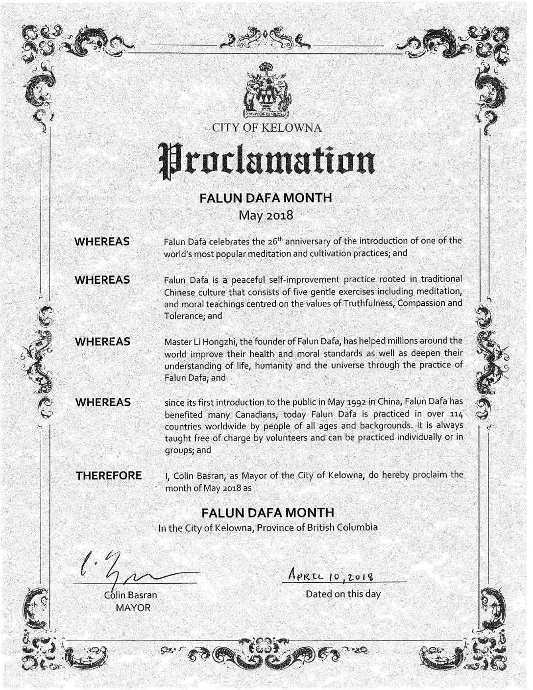 鉴于,我,基隆拿市市长Colin Basran,特此宣布二零一八年五月为基隆拿市的“法轮大法月”
