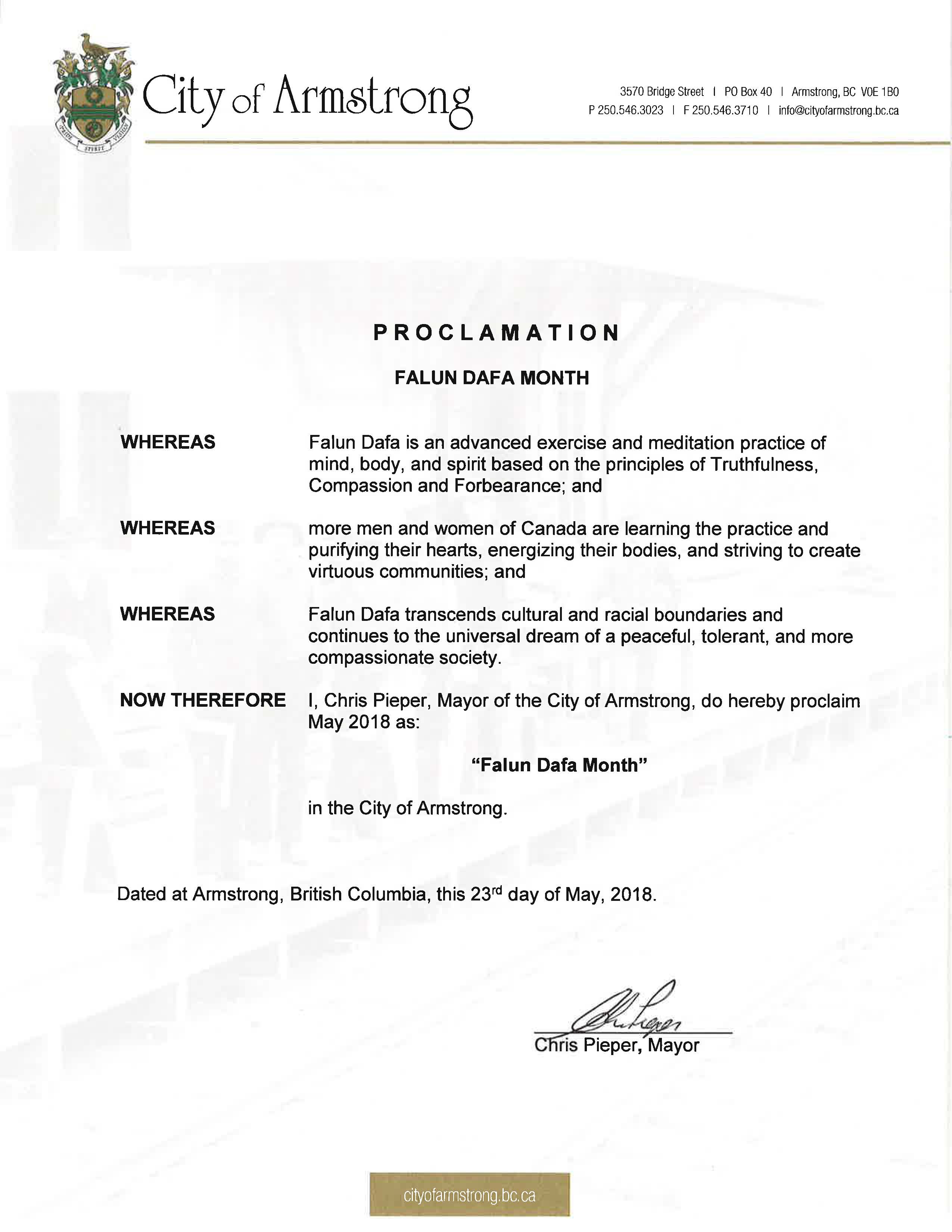 卑诗省阿姆斯特朗市(Armstrong)市长克里斯·皮珀(Chris Pieper)宣布五月为“法轮大法月”。褒奖全文如下: