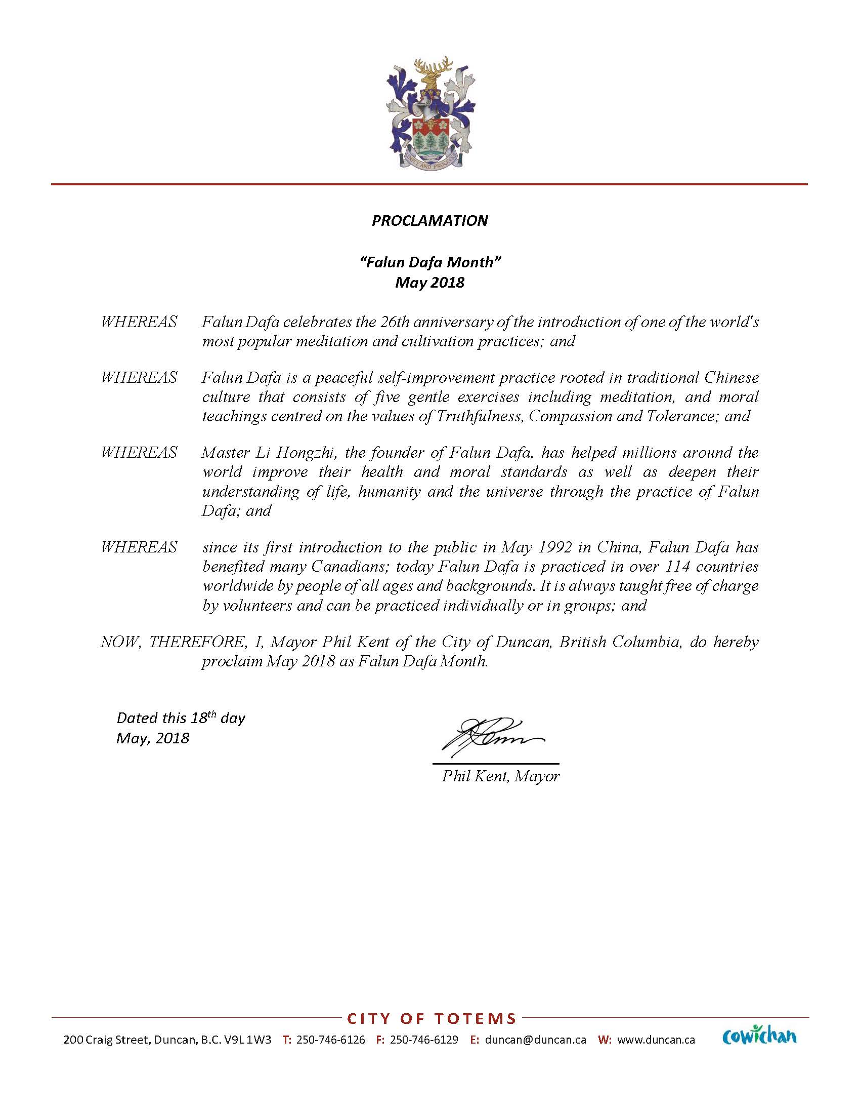 卑诗省邓肯市(Duncan)市长菲尔·肯特(Phil Kent)宣布五月为“法轮大法月”。