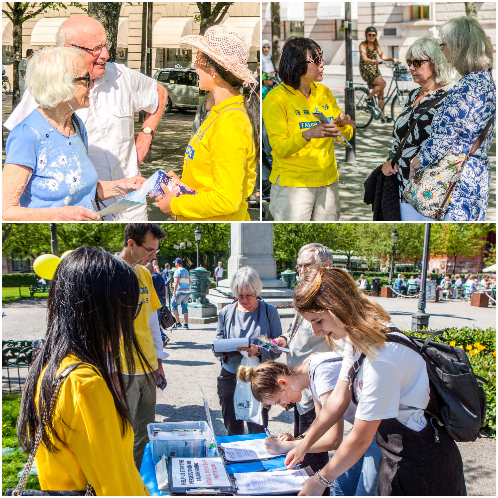 有一位来自哥德堡的留学生,他站在活动场地前,用英语在和一位西人学员交谈,他说他不喜欢中共,所以不参加它的任何组织。但他也不喜欢法轮功,并提了很多个问题,如“天安门自焚”、不许吃药等等谎言,他对活摘器官的事实真相也有疑问。学员用平和的心态向他都一一详尽地做了回答。长时间交谈之后,他如卸重负,才明白了他也是被中共的谎言欺骗了。明白了真相后,他整个人的心态就完全的转变了。显得很兴奋,临走前像好朋友一样和学员道别,看得出他是从心底里感谢告诉他真相的这些法轮功学员。