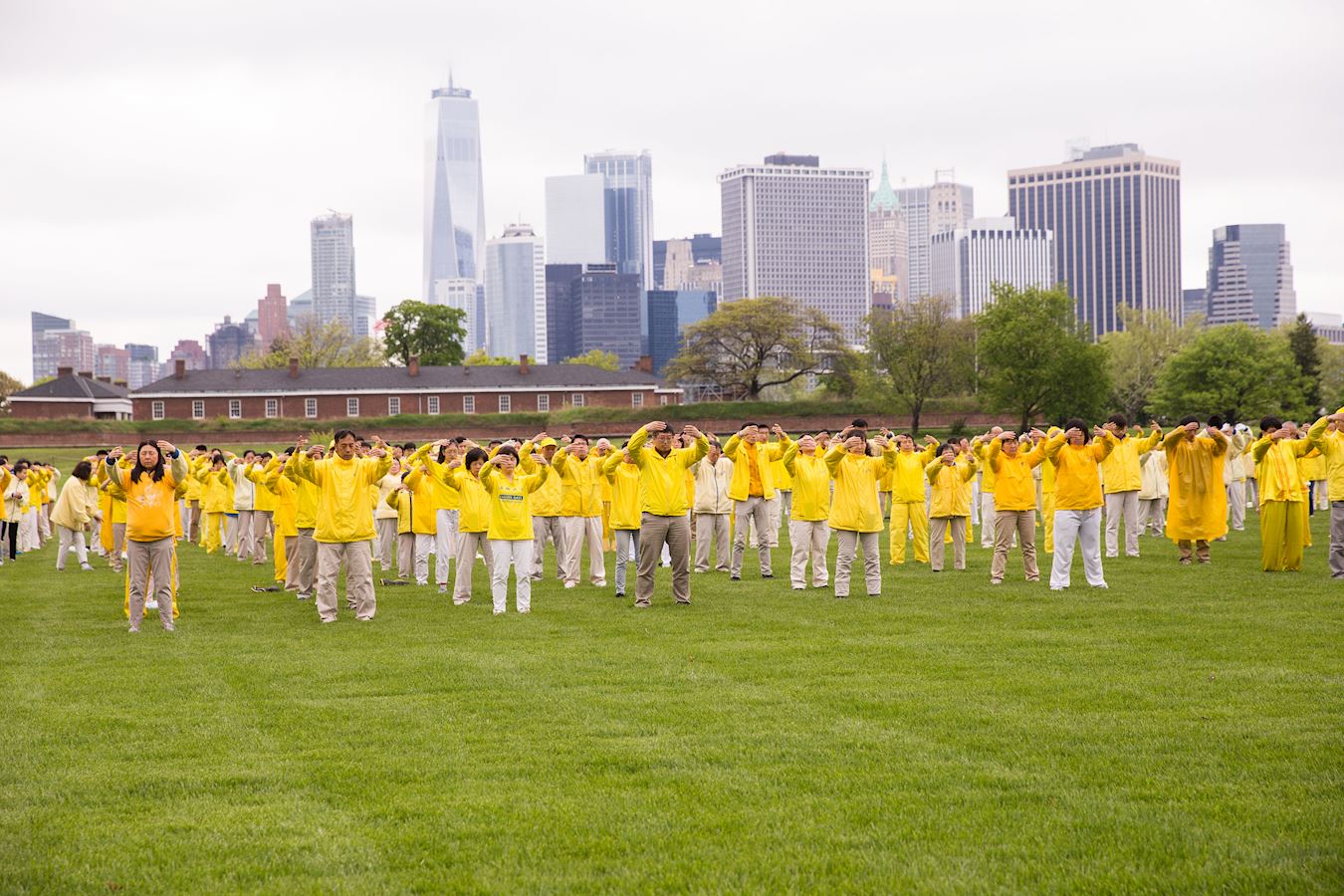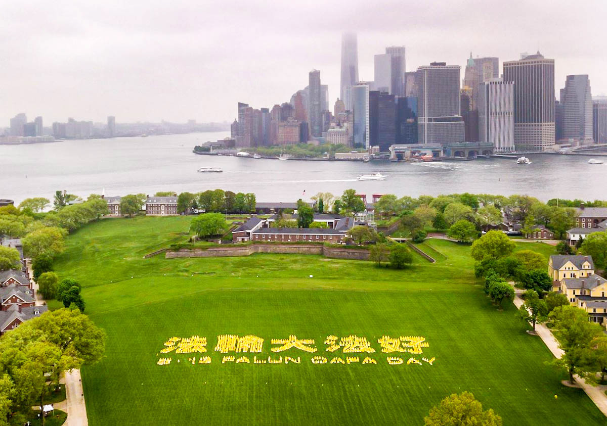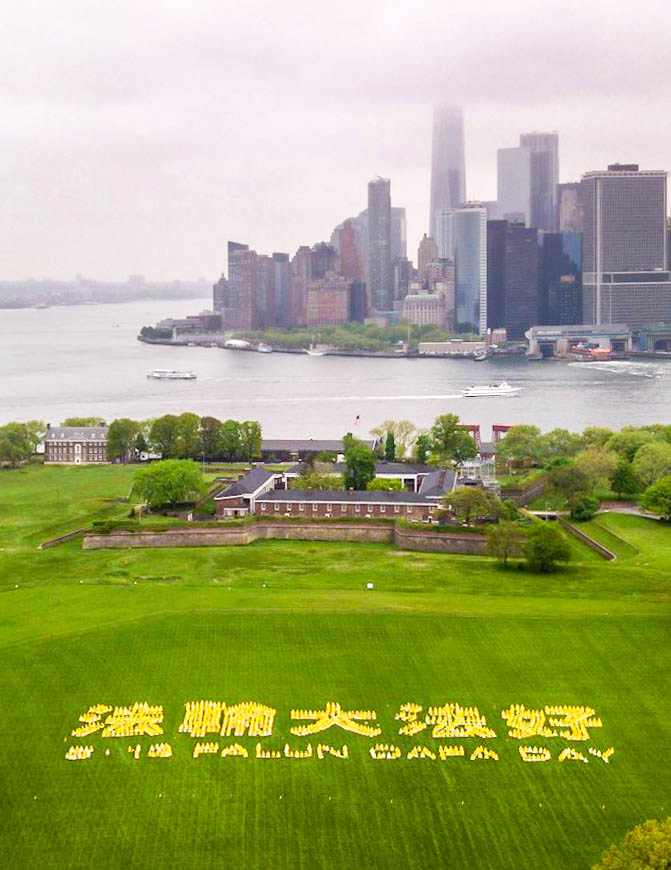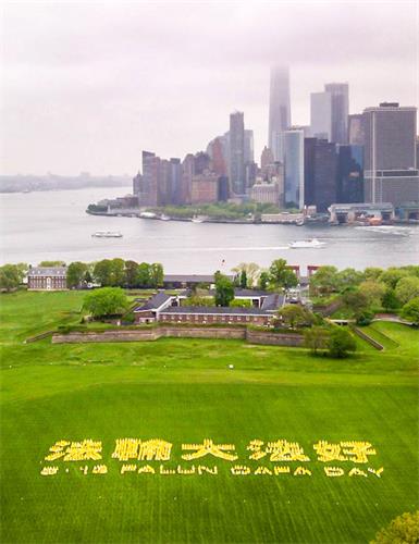当日,在总督岛生机勃勃的碧绿草坪上,五个金色中文大字“法轮大法好”和金色的英文“5.13 法轮大法日”(5.13 FALUN DAFA DAY),映衬着不远处曼哈顿朦胧的高楼大厦。一幅天然而成的美丽画作,象征着法轮大法将带给曼哈顿及全世界焕然一新的生机。