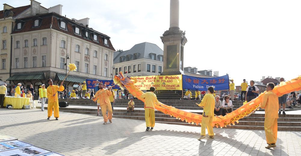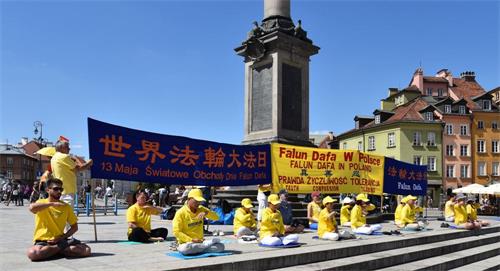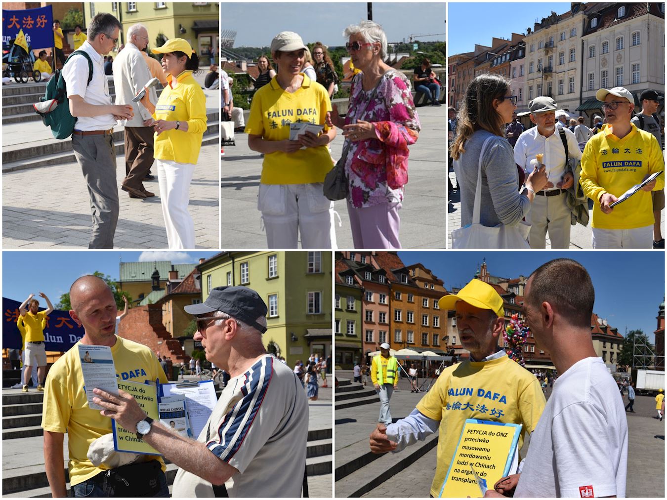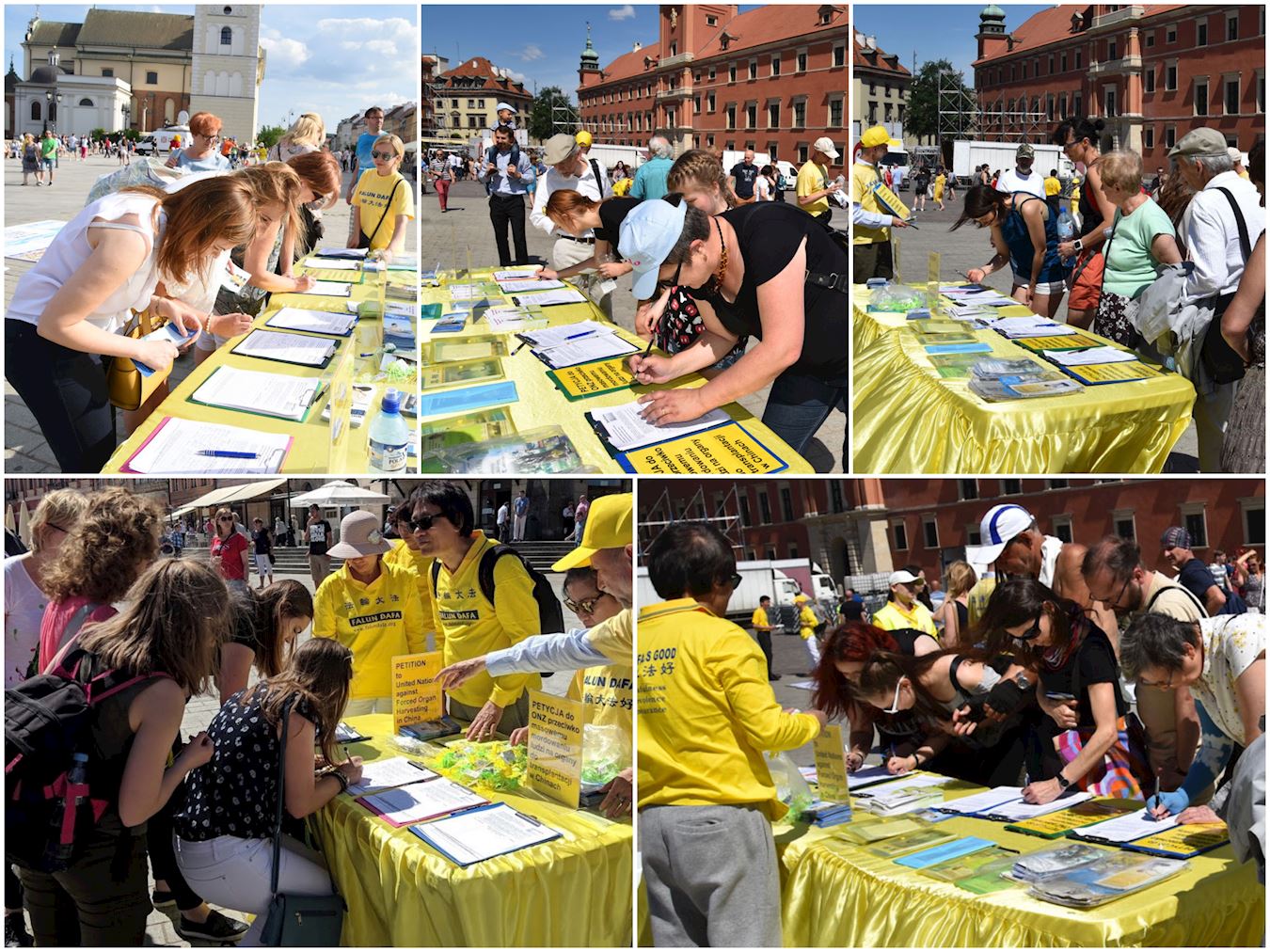 近三十米长的法轮功真相展板平铺在古城广场的地上,两个征签台上摆满了各语种法轮功真相传单及反迫害征签簿,法轮功学员用波、英两种语言向民众介绍五一三世界法轮大法日及法轮功真相,吸引了众多游客驻足观看、拍照,了解真相的民众和游客纷纷在反对中共迫害法轮功的征签簿上签字,也有很多人感兴趣学炼法轮功。